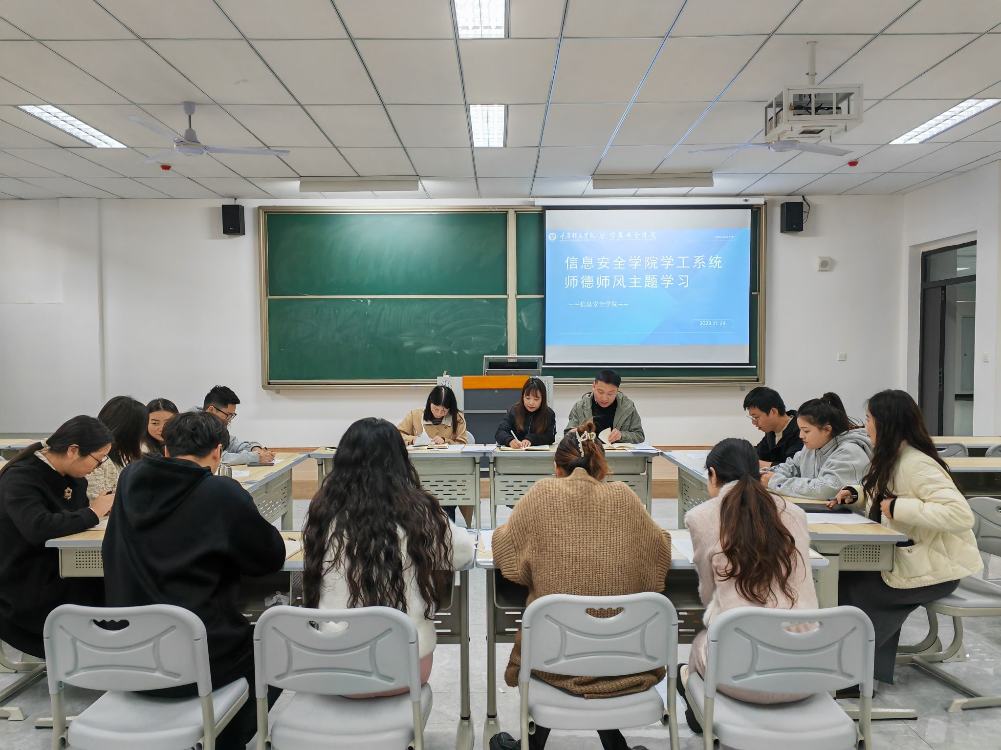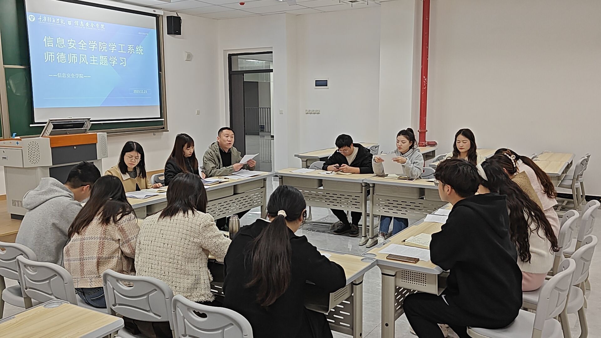 为全面贯彻习近平总书记关于师德师风的重要论述和全国教育精神,深度落实新时代教师师德师风“十项准则”,推进实施教师队伍的建设和教师行为规范。信息安全学院学工系统教职工于2023年11月23日14:30在贤者楼312开展师德师风专题活动。