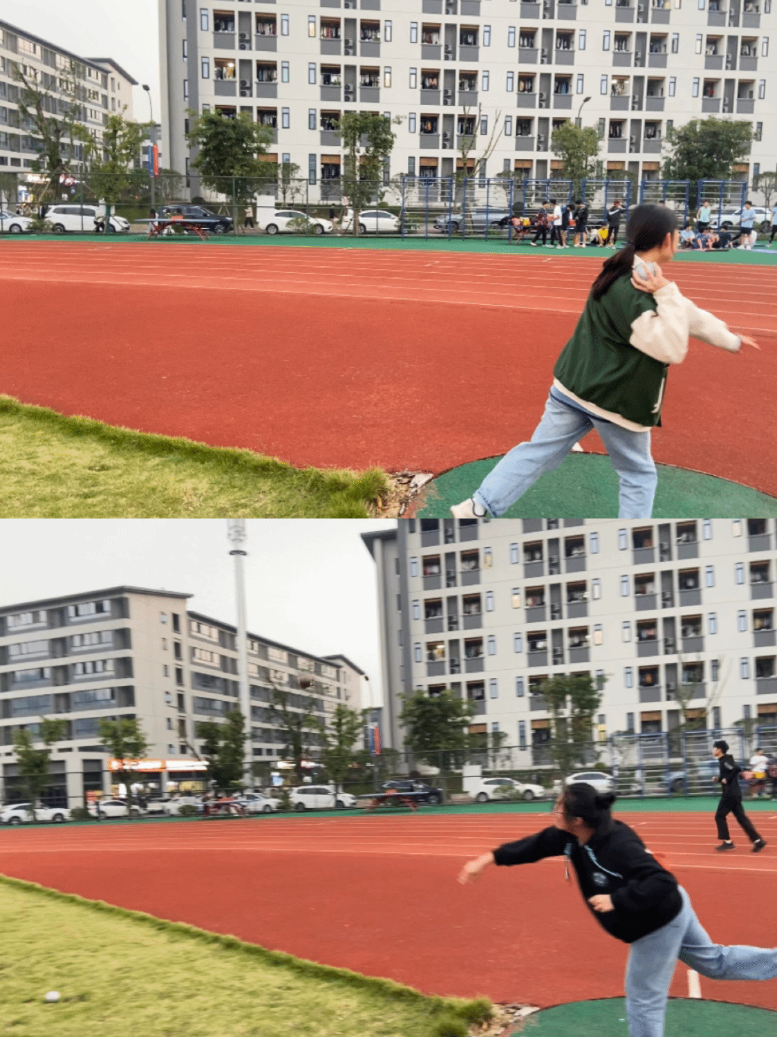 第二项活动——掷铅球。沙坑旁,选手们各已就绪,不为掌声的诠释,不为刻意地征服。他们用行动展示力量与技巧,只见运动员们身体左侧与地面垂直的瞬间,右腿迅速蹬直,上体和头部向投掷方向转动,右肩向投掷方向送出,抬头挺胸,用尽全力将沉甸甸的铅球抛出,铅球划过空中,重重地砸在地面,激起了一片尘土。他们的每一次的全力以赴只为一次问心无愧,每一次的尘土飞扬只为一次打破束缚。