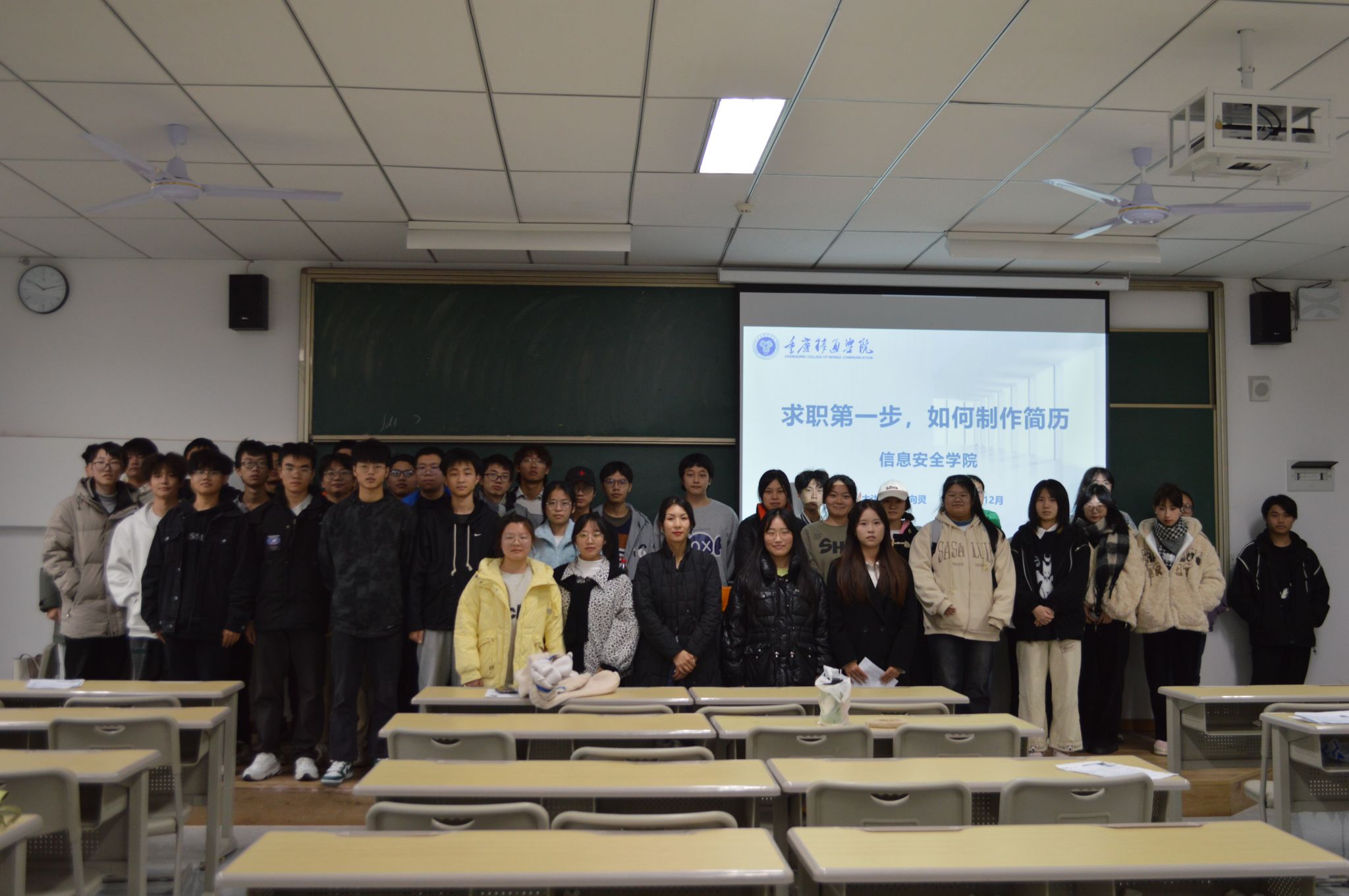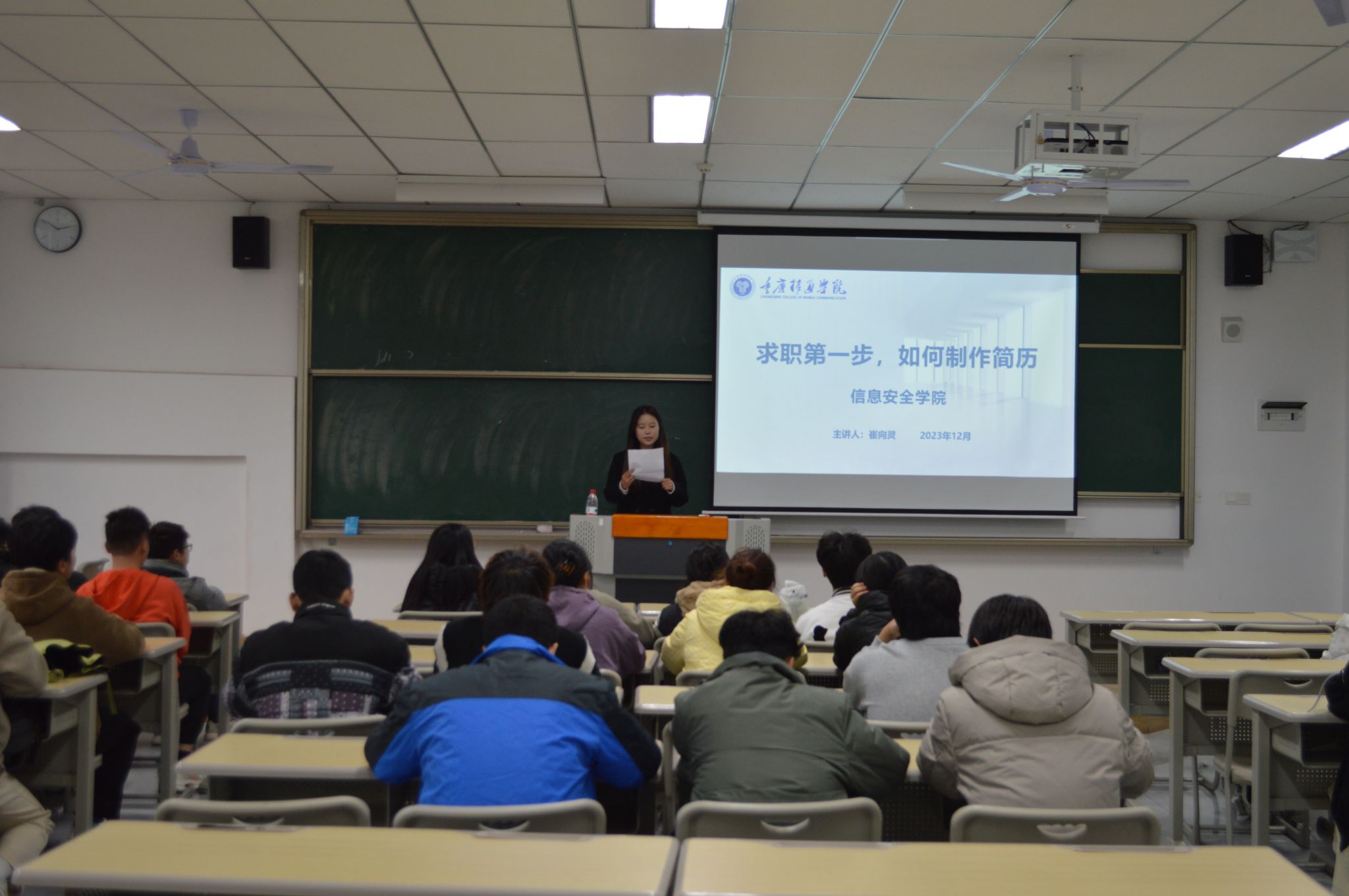 简历是展现自我最直接、最有效的途径,是未来求职生涯中的敲门砖。为提升同学们简历制作水平,精“简”人生,“职”引未来——信息安全学院承办綦江校区第20期就业沙龙活动于2023年12月1日14点在行者楼213举办,本次特邀崔向灵老师作为主讲老师,信息安全学院2022级物联网工程1班、2班全体同学参与。