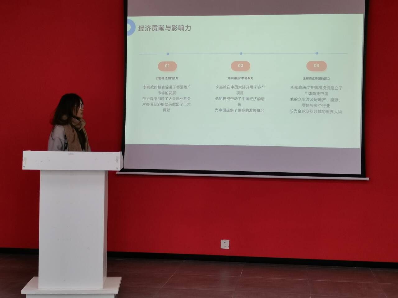 通过对李嘉诚成长背景、创业经历、经济贡献和影响力等的介绍,张广静同学认为我们大学生可以从其身上汲取很多能量,如学习方面:学会吃苦,更努力一些,坚持学习,坚信知识能够改变命运,不要怕困难,最困难的时候就是最接近成功的时候。为人处世方面:诚以待人,以和为贵,与人为善。竞争在所难免,但是我们可以多付出一些,发现你会赢得更多,因为成就事业得关键就是有人帮助你。当然还要不断锤炼自己多方面得能力,才能世事洞明,抓住机遇。要保持谦卑,但永不满足,才能不断创新,拥抱“颠覆”。