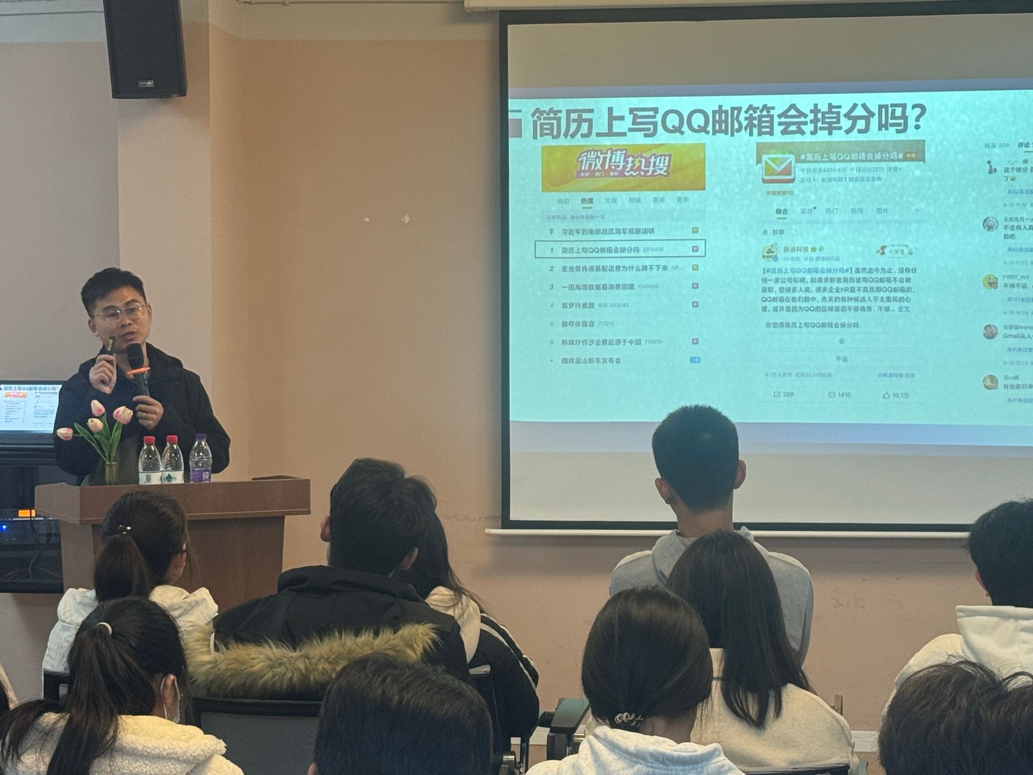 活动开始,周俊老师以热搜词条“简历上写QQ邮箱会掉分么?”引入话题,巧妙激发了学生们的思考与讨论。他深度补充和分享了关于邮箱使用的注意事项,强调在简历制作中清晰、完整展现个人信息的重要性。接着,周俊老师系统介绍了简历设计的紧迫性和相关初步准备工作,还向学生们推荐了一系列高水平的简历设计网络平台,使学生对于简历制作的内容和要点有了更为明确的认知。