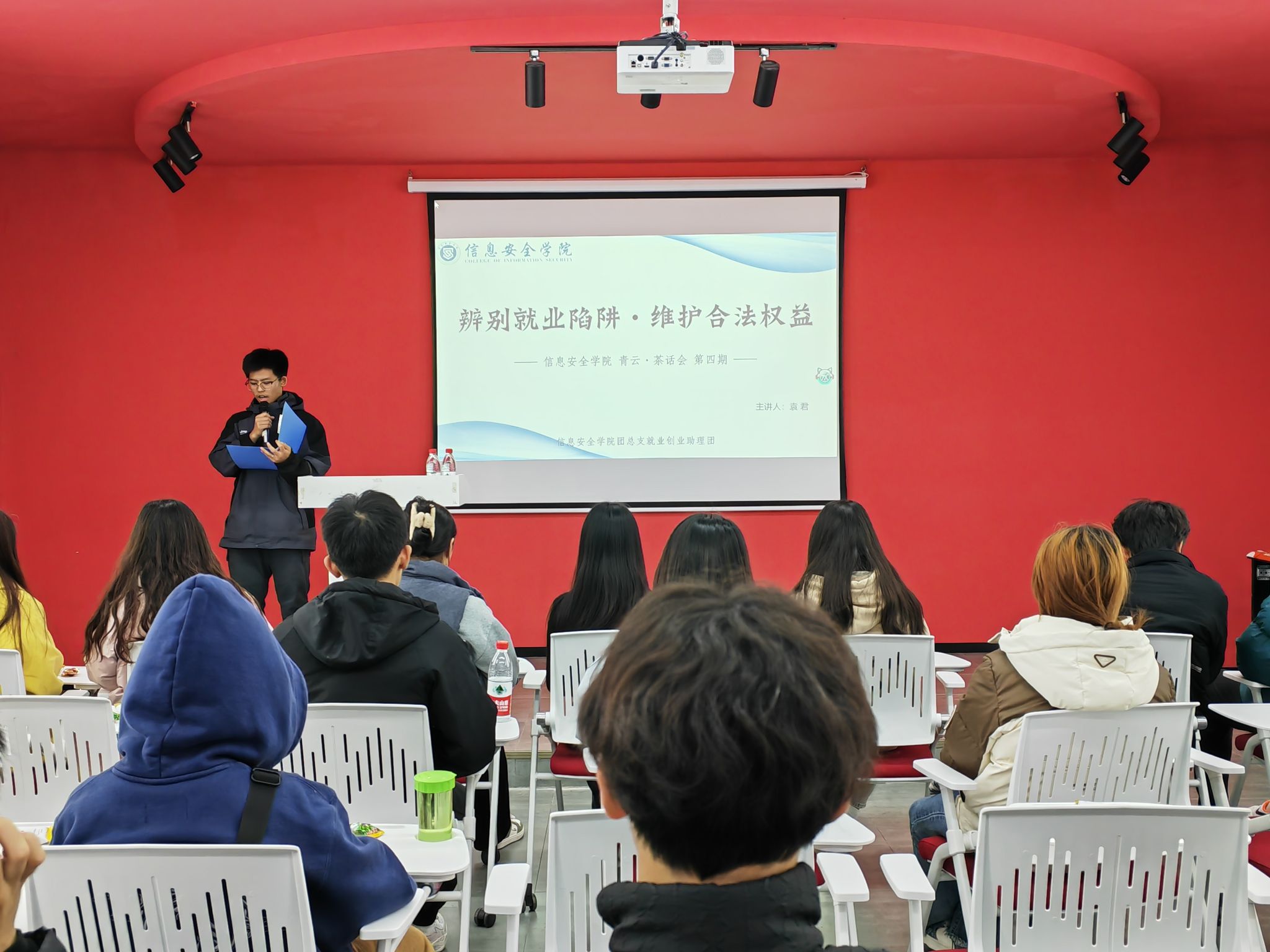 为给予学生就业指导服务,切实普及就业相关法律知识,信息安全学院团总支就业创业助理团于2023年12月13日15:00在玉棠书院talk·king演讲中心举办信息安全学院“青云•茶话会”第四期——辨别就业陷阱,维护合法权利。本次茶话会邀请到信息安全学院辅导员袁君老师作为主讲人,活动共计40余人次参与,由唐浩天主持。
