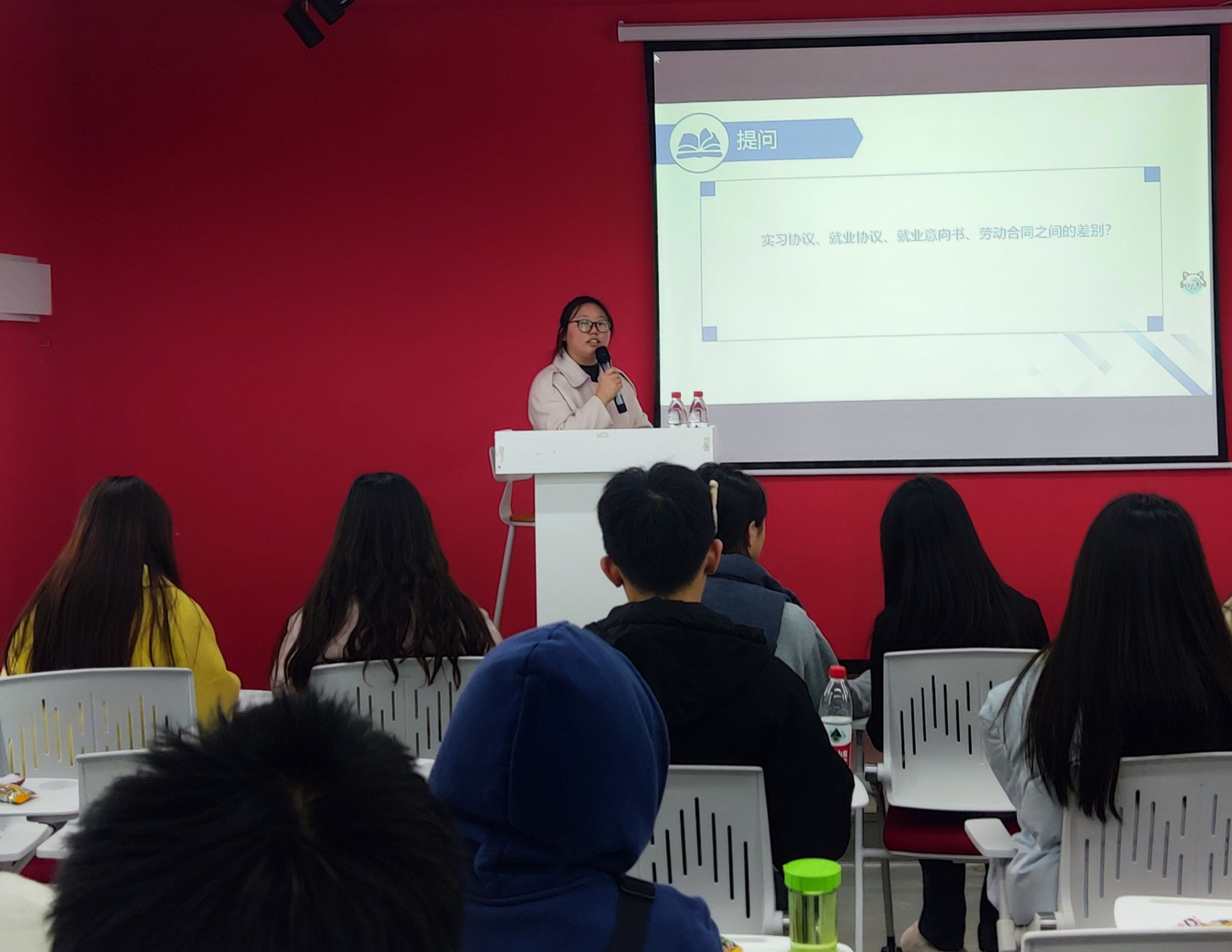 活动伊始,袁君老师通过问题引发学生对实习协议、就业协议、就业意向书、劳动合同之间差异的深入思考与共鸣。她深刻剖析了就业协议与实习协议的区别、试用期与实习期的异同、合同签订的关键要点以及合同解除的相关法律知识,结合专业领域和亲身经历,与学生们展开深刻而富有启发性的对话。