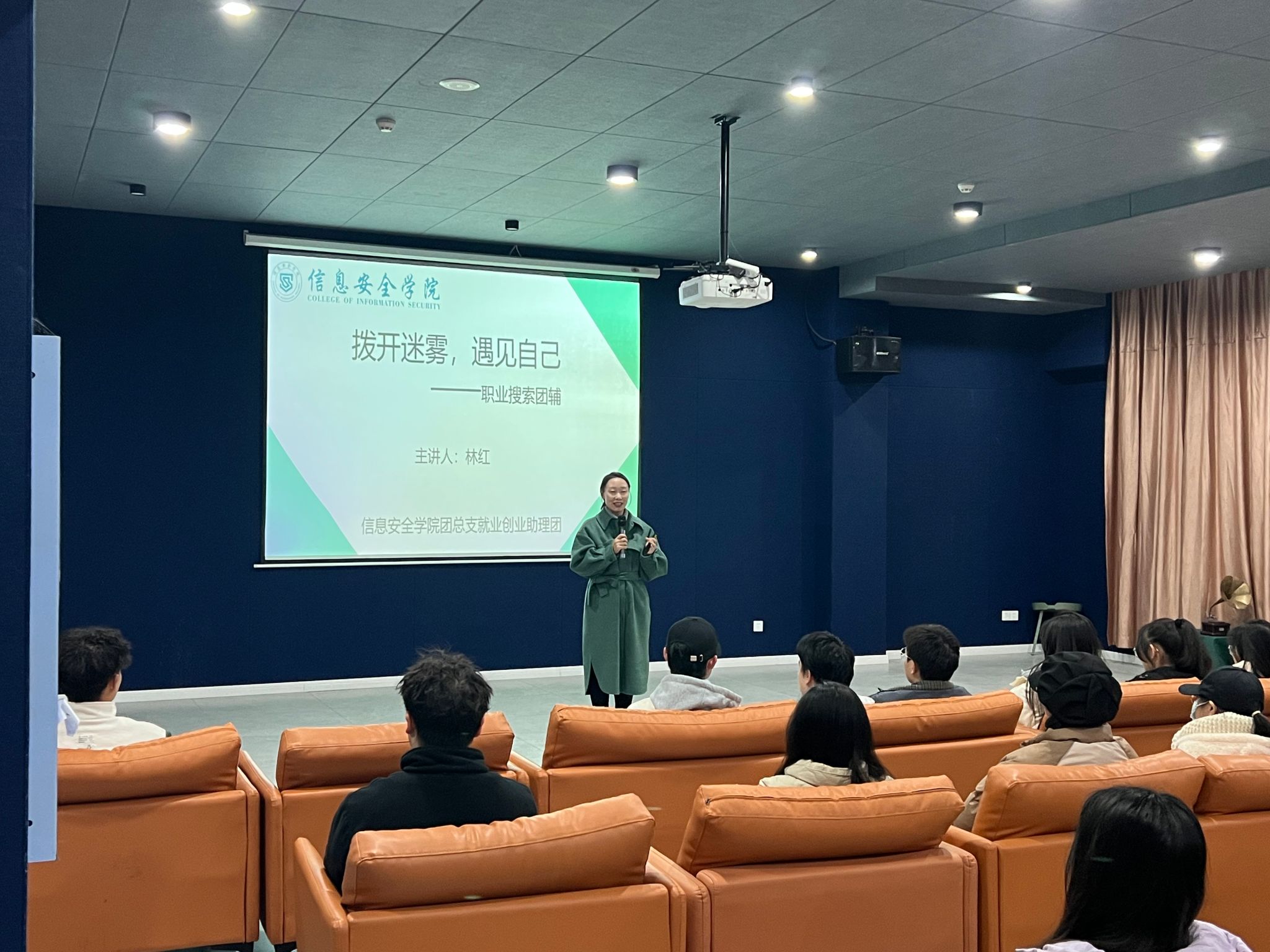 为帮助大学生提升自我,更全面地了解自身实际情况以及职业选择。信息安全学院于2023年12月15日15:00在綦河书院银河·影音室举办綦江校区团辅活动第11期——信息安全学院“拨开迷雾·遇见自己”。本次活动邀请到学生处心理健康教育与咨询中心专职心理教师林红老师作为主讲人,信息安全学院辅导员郭秋思老师以及40余名同学参与。