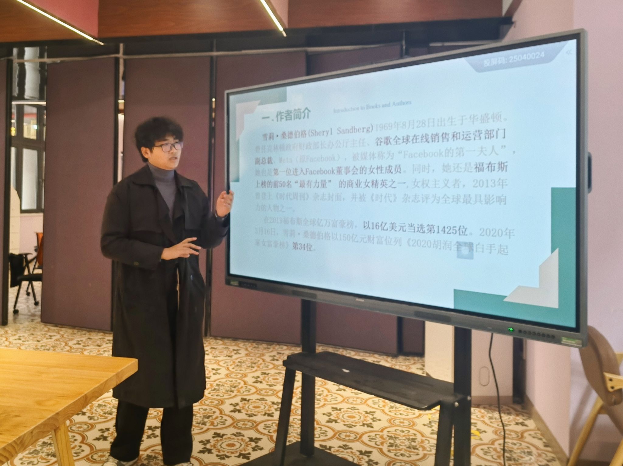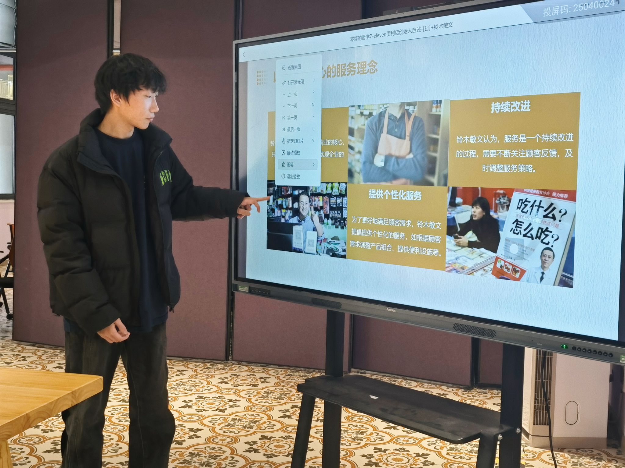 首先由第二小组分享书籍《零售店哲学:7-eleven便利店创始人自述》。李俊杰同学详细为同学们介绍了7-eleven公司从创立到成为全球连锁零售巨头的历程。通过分享让其他同学领略到了7-eleven成功的经验和创业的精神,也明白了重视顾客需求、创新经营模式和精细化管理的重要性。并为同学们展示了成功企业家的智慧和勇气。第三小组刘轩同学为大家分享了书籍《向前一步》,在他的讲解下同学们大概了解了作者的事业经历,作者在书中激励女性勇于接受挑战,满怀热情地追求自己的人生目标。让同学们明白除了坚持不懈以外也要拥有一颗自信的心,这样才能得到成功的道理。