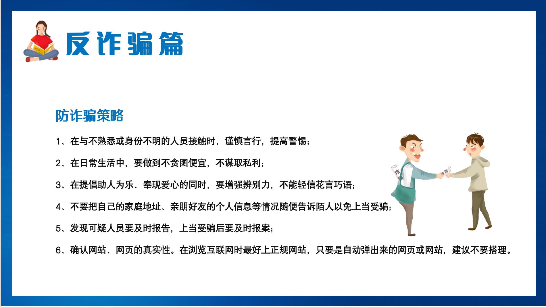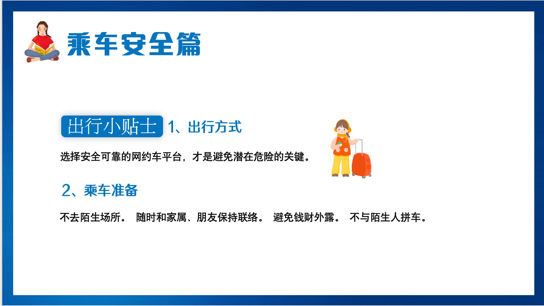 覃志蓉老师从大学生自身出发,围绕诈骗篇、乘车安全篇、人身安全篇三个方面强调了安全教育的重要性。首先,随着网络的发展,网络诈骗形式越来越多样,大学生上当受骗的案例层出不穷。因此,同学们在生活中要谨慎言行,提高警惕,要增强辨别力,以免上当受骗,发现可疑人员要及时报告,上当受骗后要及时报案。其次,交通安全也是重中之重,学生出行应选择安全可靠的网约车平台;随时和家属、朋友保持联络;避免钱财外露;不与陌生人拼车;发现特殊情况,立即报警、呼救,充分利用身边物品作为武器,保护人身安全!最后,作为大一学生,大家一定熟悉应急逃生路线或出口,在宿舍不乱拉电线、不违章用电、不违规使用大功率电器,避免火灾发生。同时要注意食品卫生安全,养成良好的科学合理的饮食习惯,加强锻炼,强健体魄。
