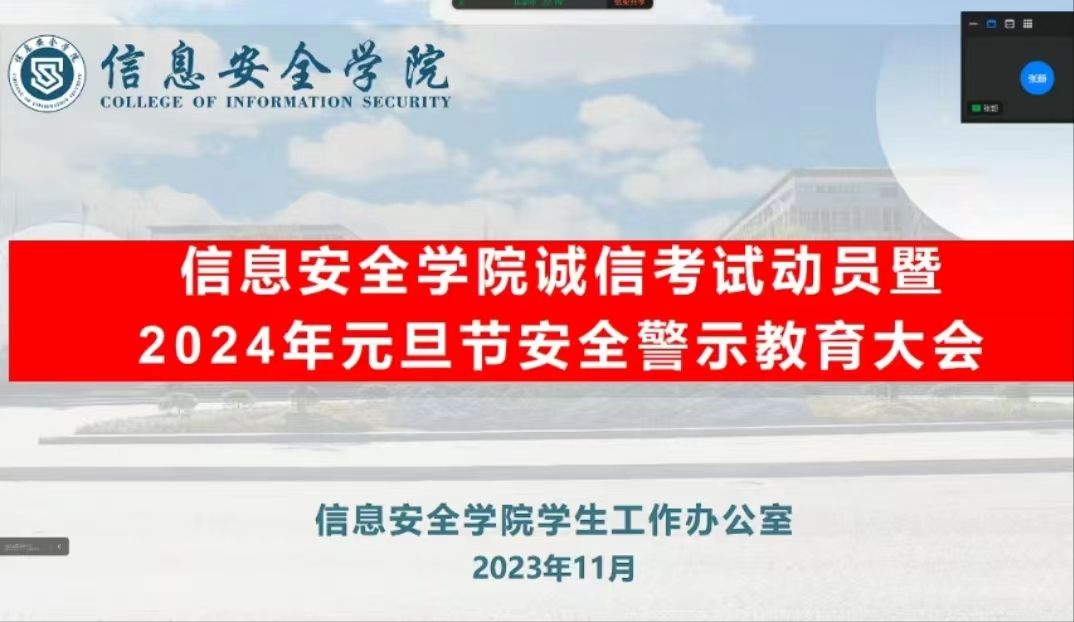 2023年12月21日信息安全学院软件工程7-12班于晚上6:00准时召开安全警示教育大会和诚信考试动员,让同学们安全度过元旦节,培养同学们的安全意识,通过幻灯片的宣讲,让同学们知道诚信考试的重要性和作弊的影响。