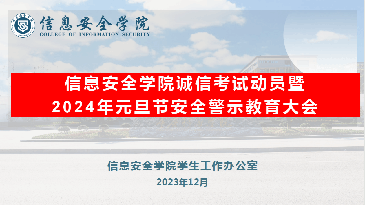 为培养学生诚实守信的品质,提醒大家注意假期安全问题,在期末考试来临之际,可以平安度过元旦假期,信息安全学院2022级软件工程7-12班于2023年12月20日在线上举办了以“诚信为先,安全至上”为主题的诚信考试动员暨2024年元旦节安全警示教育大会。