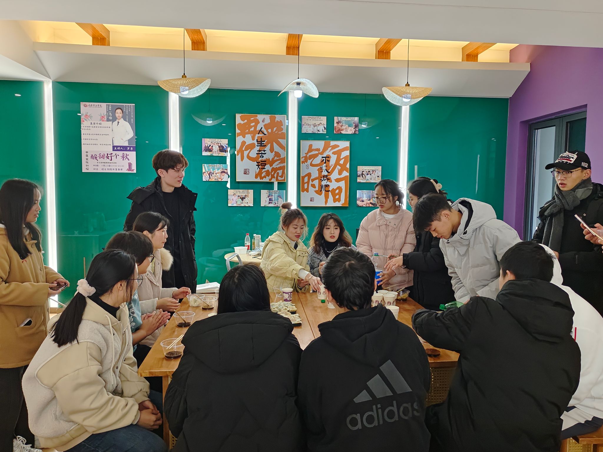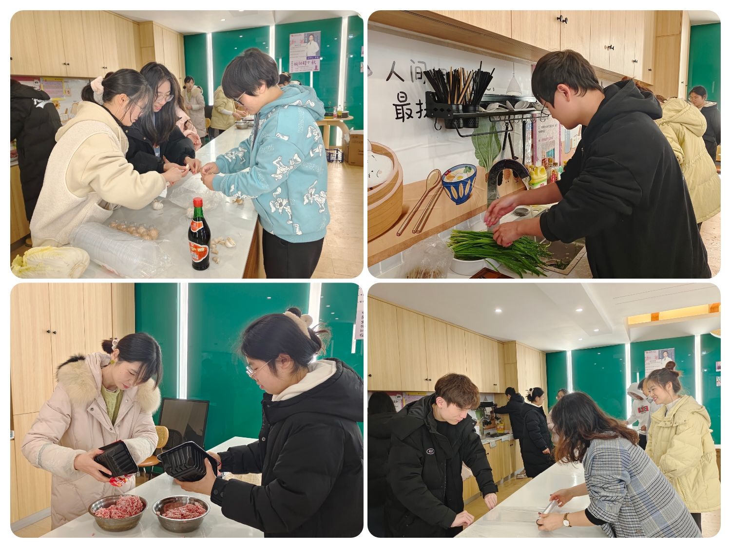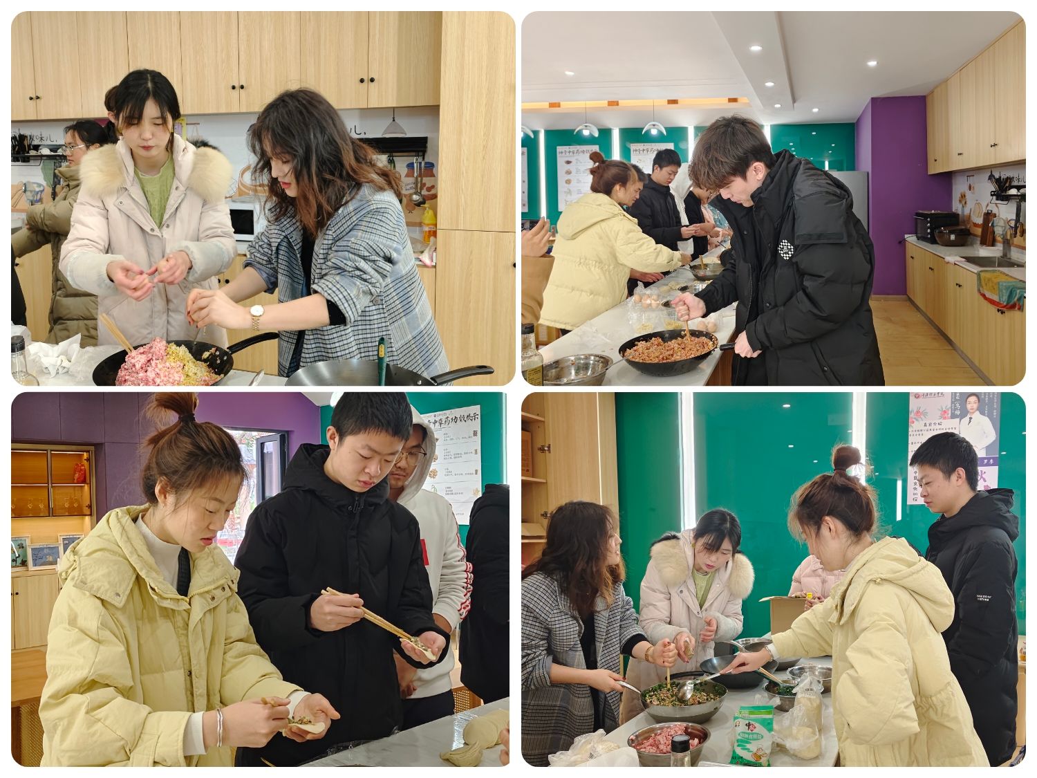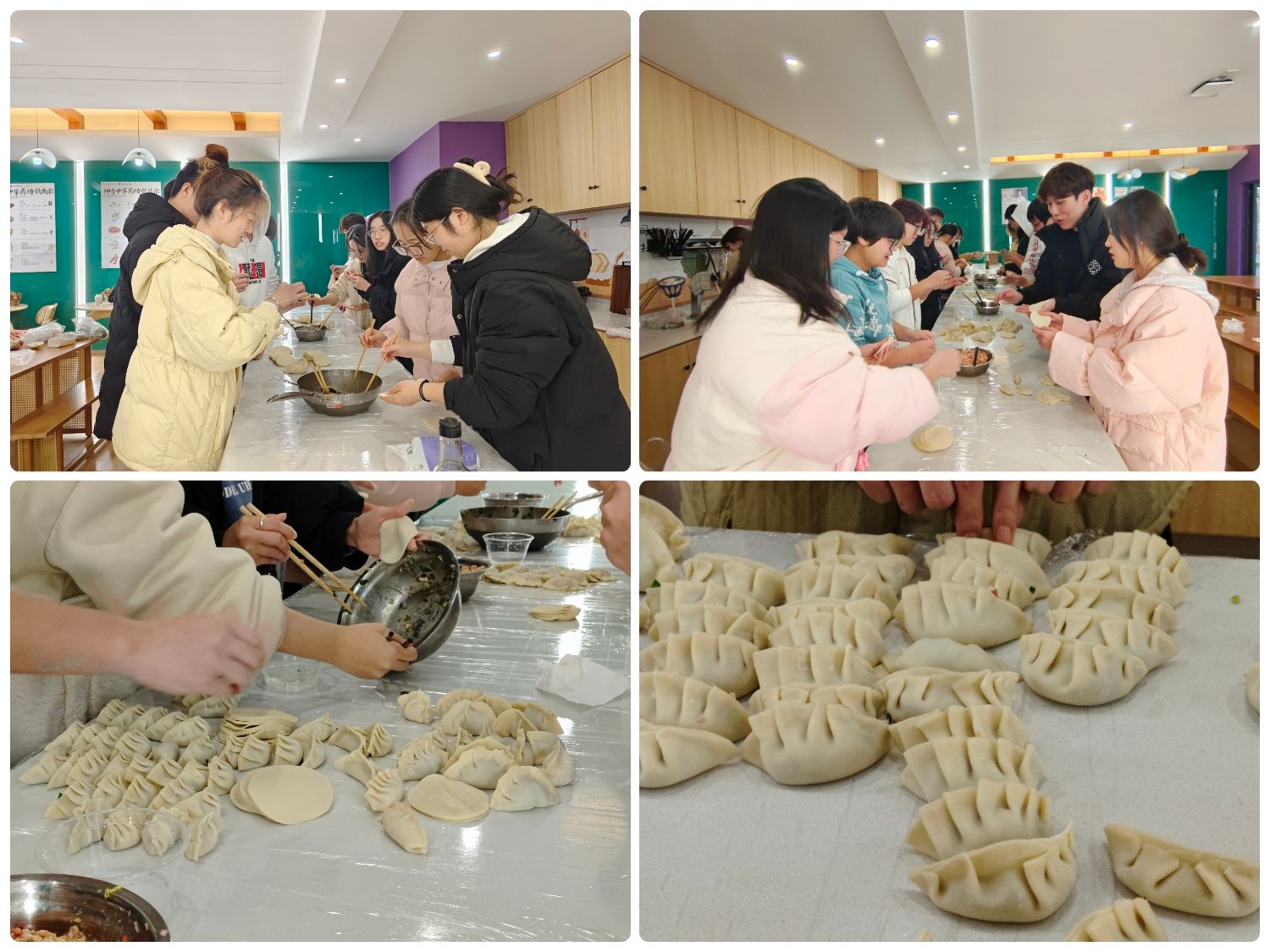 在导师们和同学们的共同努力下,完成了包饺子的准备工作。彭丽珺老师和冉叶虹老师调味拌馅儿,并细心询问同学们的咸辣忌口;陈自力老师力气比较大,负责馅料搅拌混匀;罗小会老师耐心教同学们包饺子。