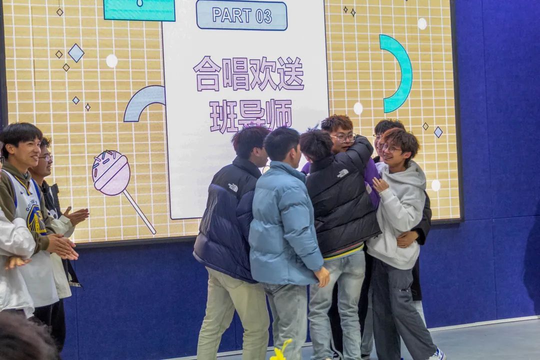 活动最后,在“合唱欢送班导师”中,主持人邀请各班班导师上台接受同学们的祝福,同时班导师们选择杨博作为代表给同学们送出美好寄语,同学们也纷纷上台给自己的班导师送出拥抱,送上无法言表的祝愿!