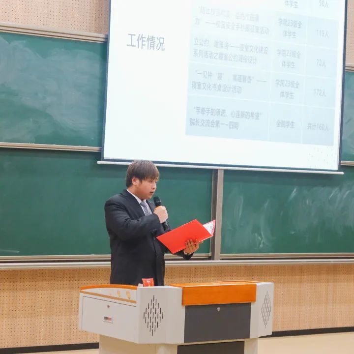 议程后期,学工副院长尹金维对这一学期的工作进行了总结,主要从各部门工作内容,工作成果,以及工作不足三个方面陈述,在此同时希望各部门可以互相学习、共同成长,更好地为学院各部门的发展贡献力量。