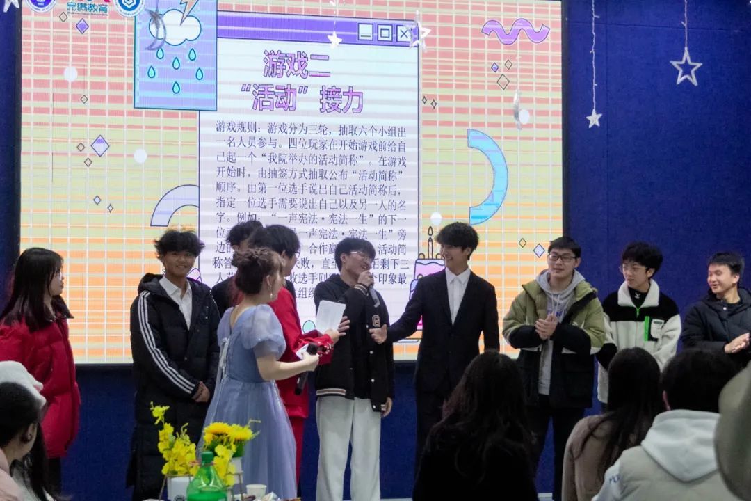 青年志愿者协会的《最炫民族风》,调研部的《好摇不挑曲》彻底点燃现场气氛。“活动”接力环节,以各部门所举办的活动为名,进行左右名称接力。