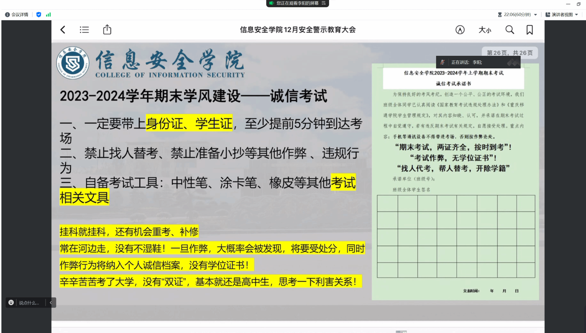 为了加强学生安全意识的培养和对诚信考试的认知,信息安全学院全体辅导员于2023年12月20日—24日利用线上线下等多种方式集中组织各年级各专业班级开展“诚信考试动员暨2024年元旦节安全警示教育”相关活动,覆盖3000余名学生。大会主题包括诚信考试、假期安排和9个安全议题共11项内容。