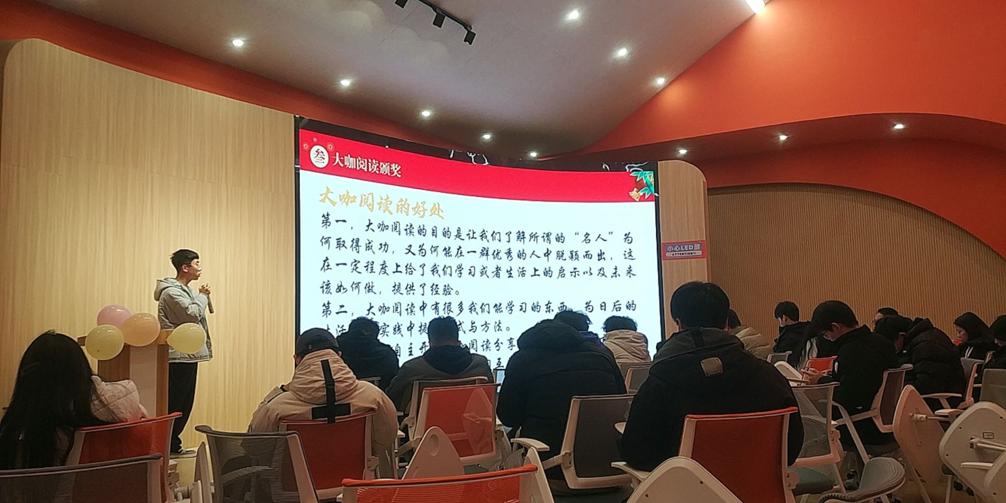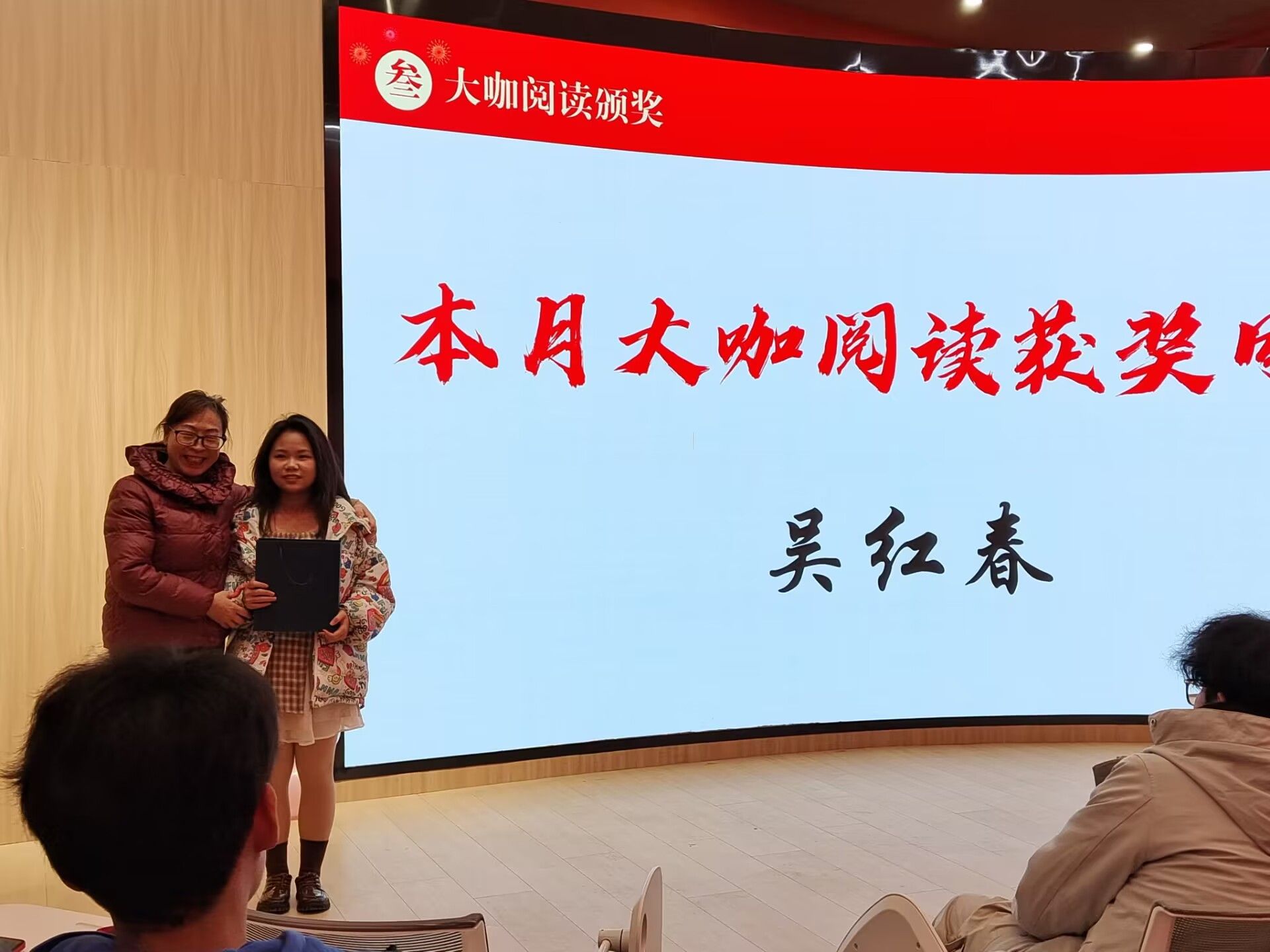 视频结束后,在轻松的氛围下也迎来了本次活动的重头戏,12月大咖阅读优秀读书笔记颁奖仪式。主持人首先向学生们讲述了大咖阅读的意义。大咖阅读在一定程度上给了学生们学习或者生活上的启示以及未来该如何做提供了经验,为日后的生活学习实践中提供方式与方法。随后由异科导师蒙嘉方为优秀读书笔记获奖学生吴红春颁发了奖品。