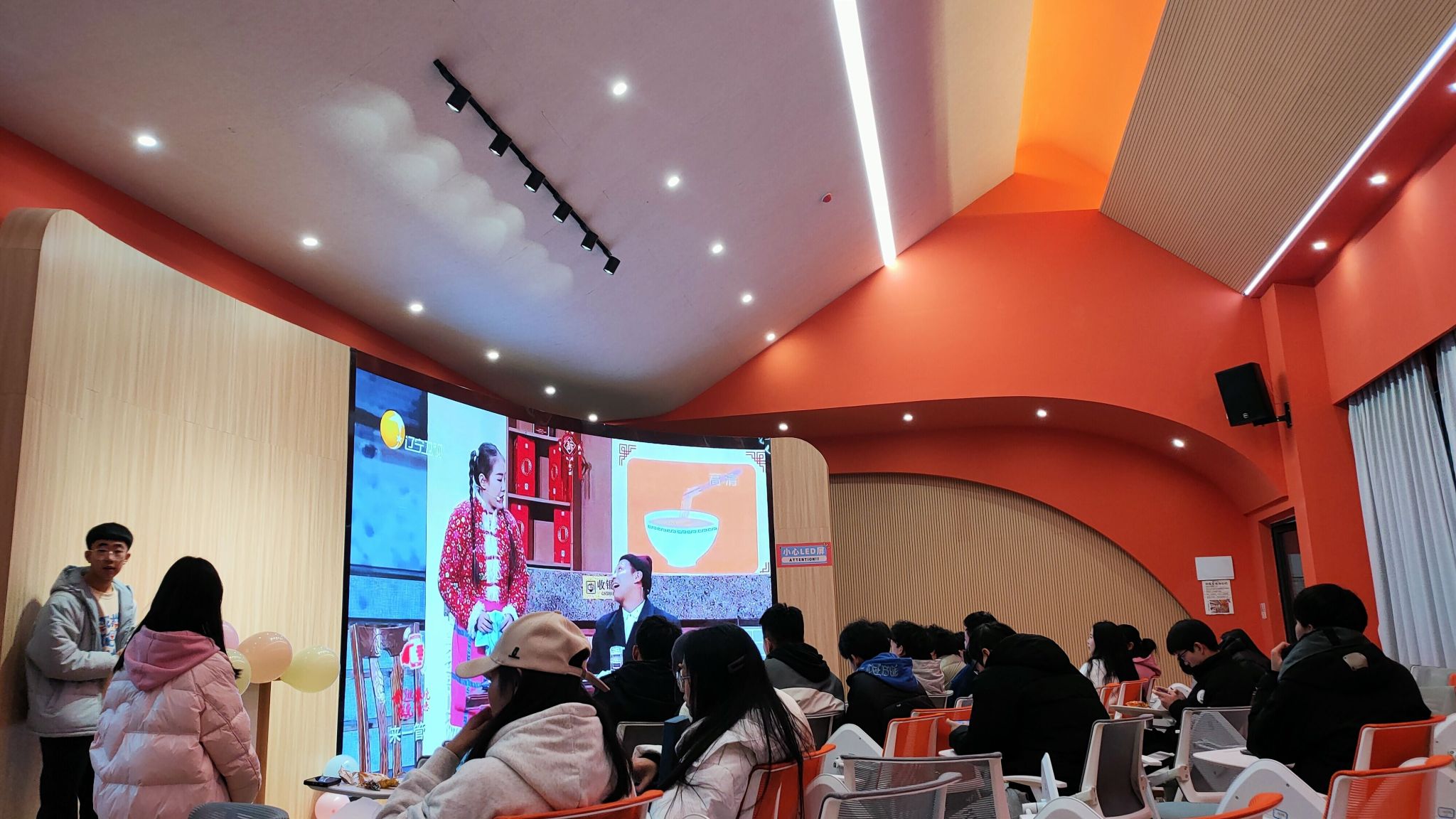在“你来比划我来猜”的环节中,参与人员进行了分组以及抽取词条后便正式开始了。学生们为了能在游戏中以更少的时间取胜,所表现出来的动作可谓是各有千秋,有的甚至逗得大家开怀大笑。在进行完第一轮游戏后,第二个游戏便是“逛三园”,而这个游戏目的则是考验大家的知识储备量,只有最后留在场上的才是最终的胜者。经过了激动人心的游戏环节,舒缓心情的视频也接踵而至,宋小宝等人主演的小品《吃面》也惹得众人捧腹大笑。