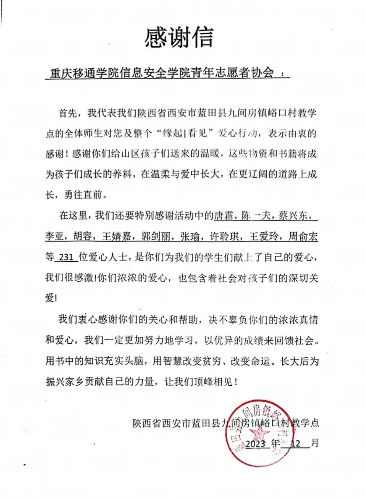 穿越山丘与河流,将温柔与善意传达,纵使距离遥远,也能将爱意洒满世间每一个不起眼的角落。为进一步促使同学们关爱留守儿童,呵护山区儿童的求学梦,向孩子们送去温暖与希望。由西安市新城区炬益星志愿服务中心、南京江灵素实文化传媒有限公司、重庆移通学院主办,信息安全学院团总支青年志愿者协会承接的“以我之手,圆彼之梦”关爱留守儿童活动顺利开展并于12月28正式完结。