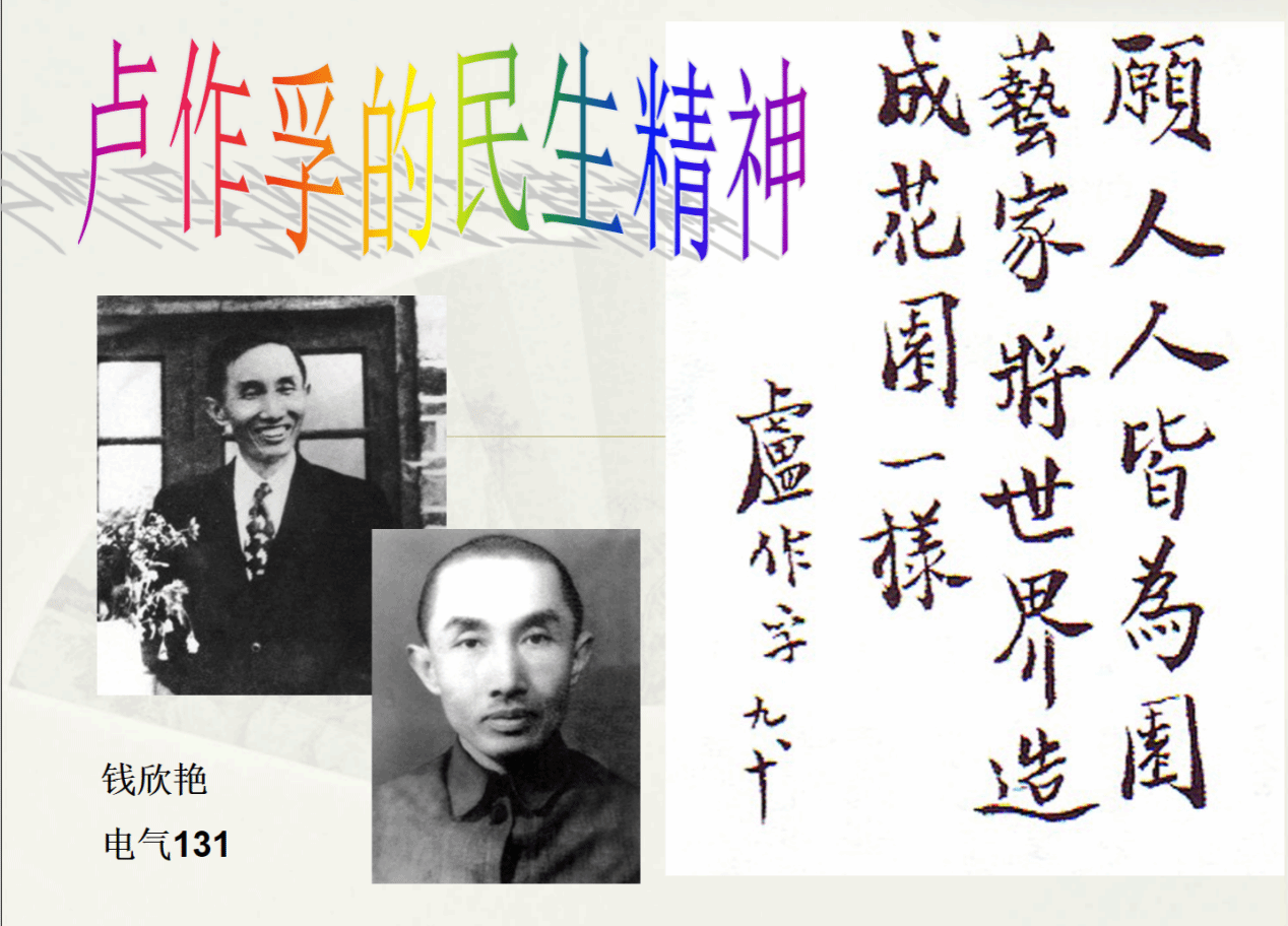 毛泽东同志称赞他是 “发展中国民族工业不能忘记的四位实业界人士之一”,卢作孚先生爱国爱民的民生精神和民族大义也是我们当代大学生学习的楷模,我们不能忘记他为国家为民族所作出的巨大贡献。