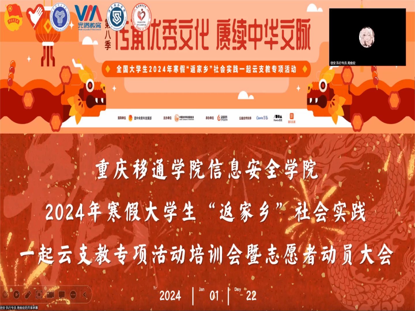 为了激发青年志愿者的热情和动力,提升责任感和使命感,2024年1月22日,信息安全学院开展了“一起云支教”专项活动线上志愿者动员大会。本次会议由信息安全学院执行专员周俞宏主持,参与活动的全体志愿者参会。