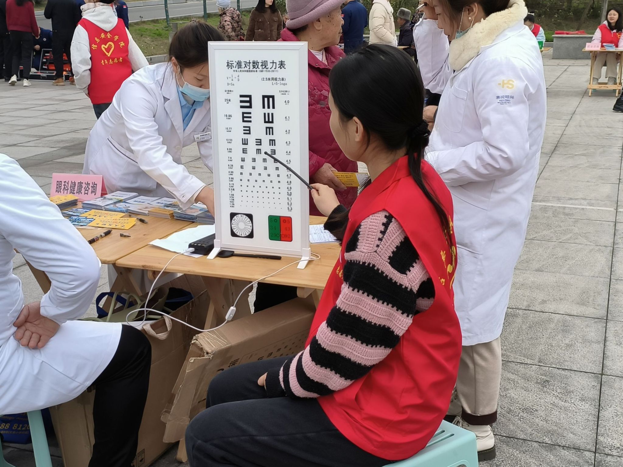 健康服务区域,医护人员为社区居民提供免费体检问诊。志愿者在旁同前来咨询就诊的群众进行交流,叮嘱居民定期检查药品有效期,帮助居民进行视力测试,口腔卫生检查。