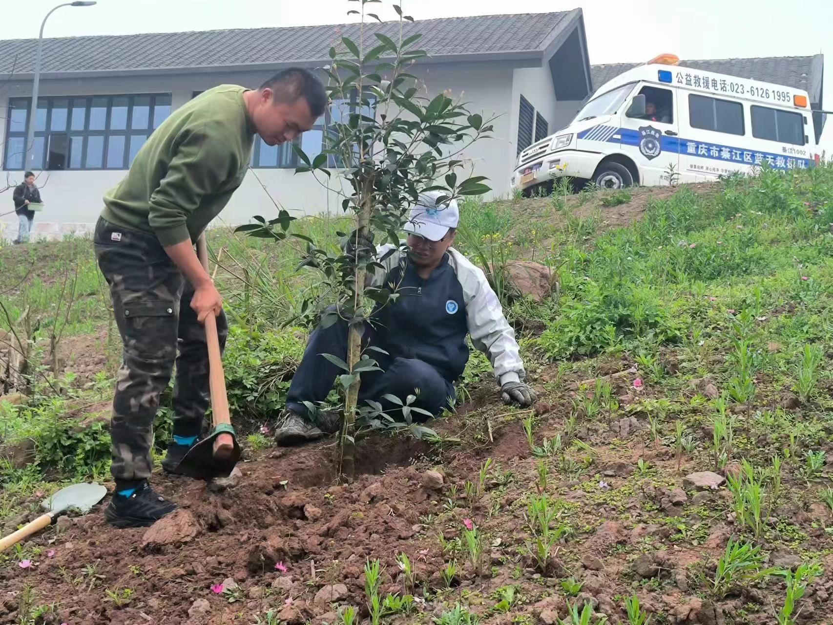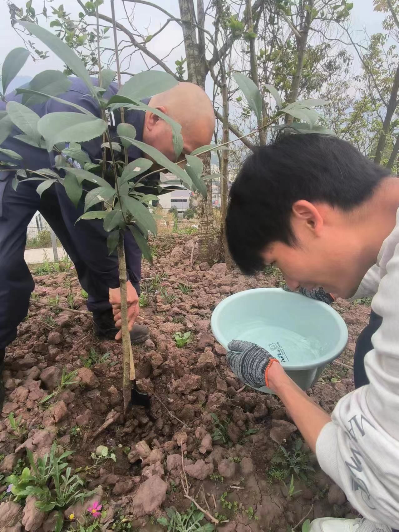 装载好待栽种的树苗,大家回到校园,学生们分工合作,大家齐心协力,共同为这片土地播撒绿色的希望。在植树的过程中,学生们不仅锻炼了自己的动手能力,更增强了团队协作意识。张桃老师也与同学们一起种树,一起挥洒汗水,为保护坏境献出自己的一份力量。