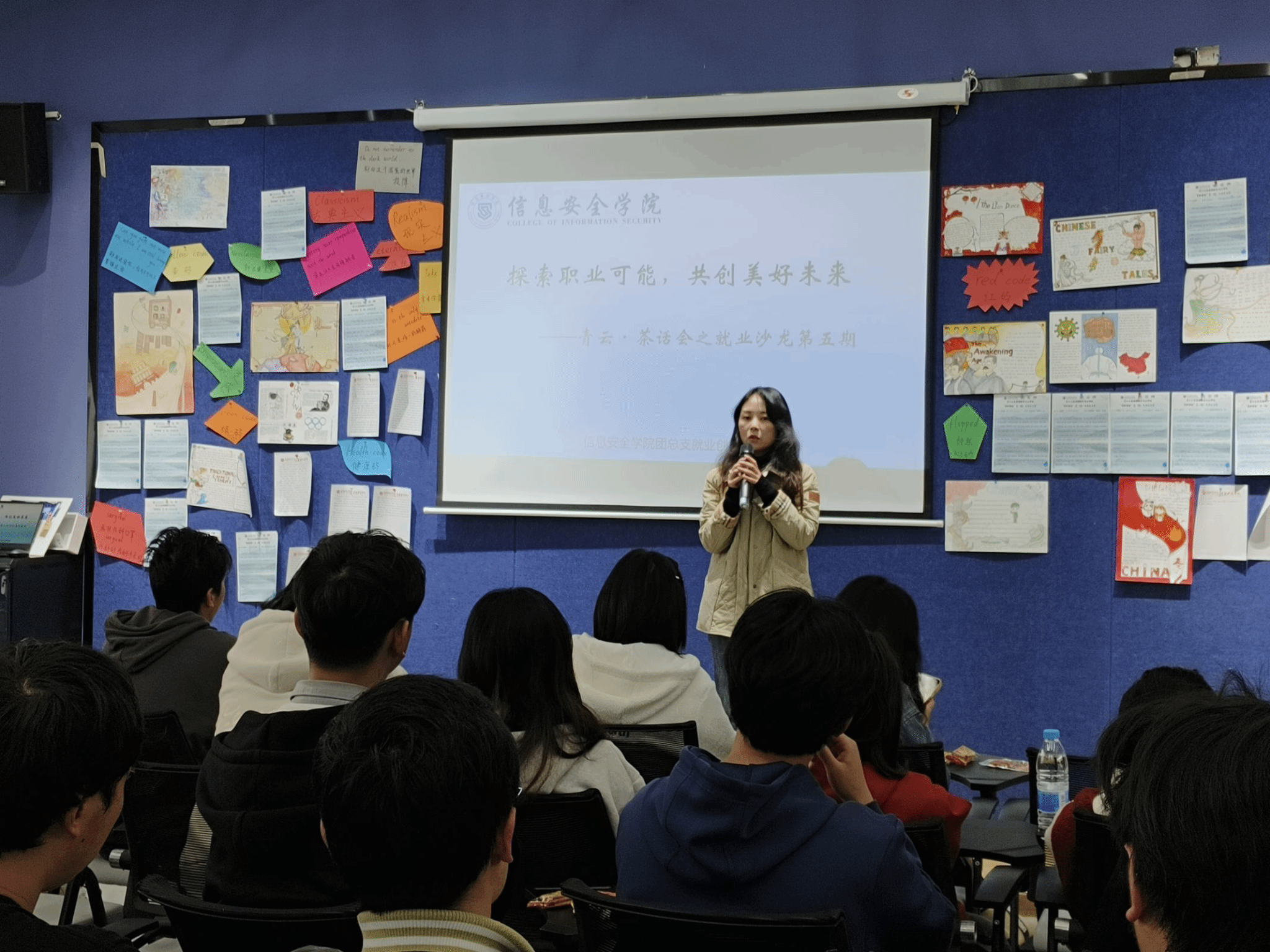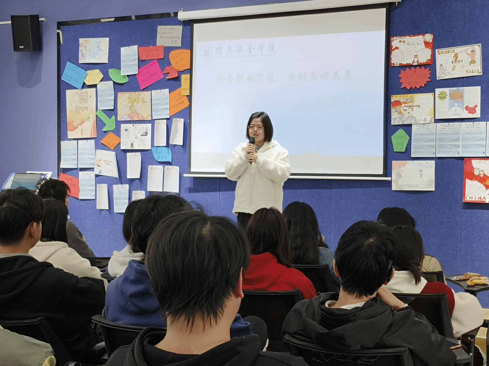 在快节奏的现代生活中,每个人都渴望找到一份理想的工作,实现自我价值,共创美好未来。为了帮助学生和求职者更好地了解就业市场,探索职业可能,由信息安全学院团总支就业创业助理团举办的探索职业可能·共创美好未来——信息安全学院就业沙龙第九期活动于2024年3月13日16:30—18:30在綦河书院2号楼,两句·演讲培训室开展。本次活动有幸邀请到来自淬炼商学院的杜嘉、龚玲、杨佩璇三位老师到场分享。活动共计50余人次参与,由陈馨桢同学主持。