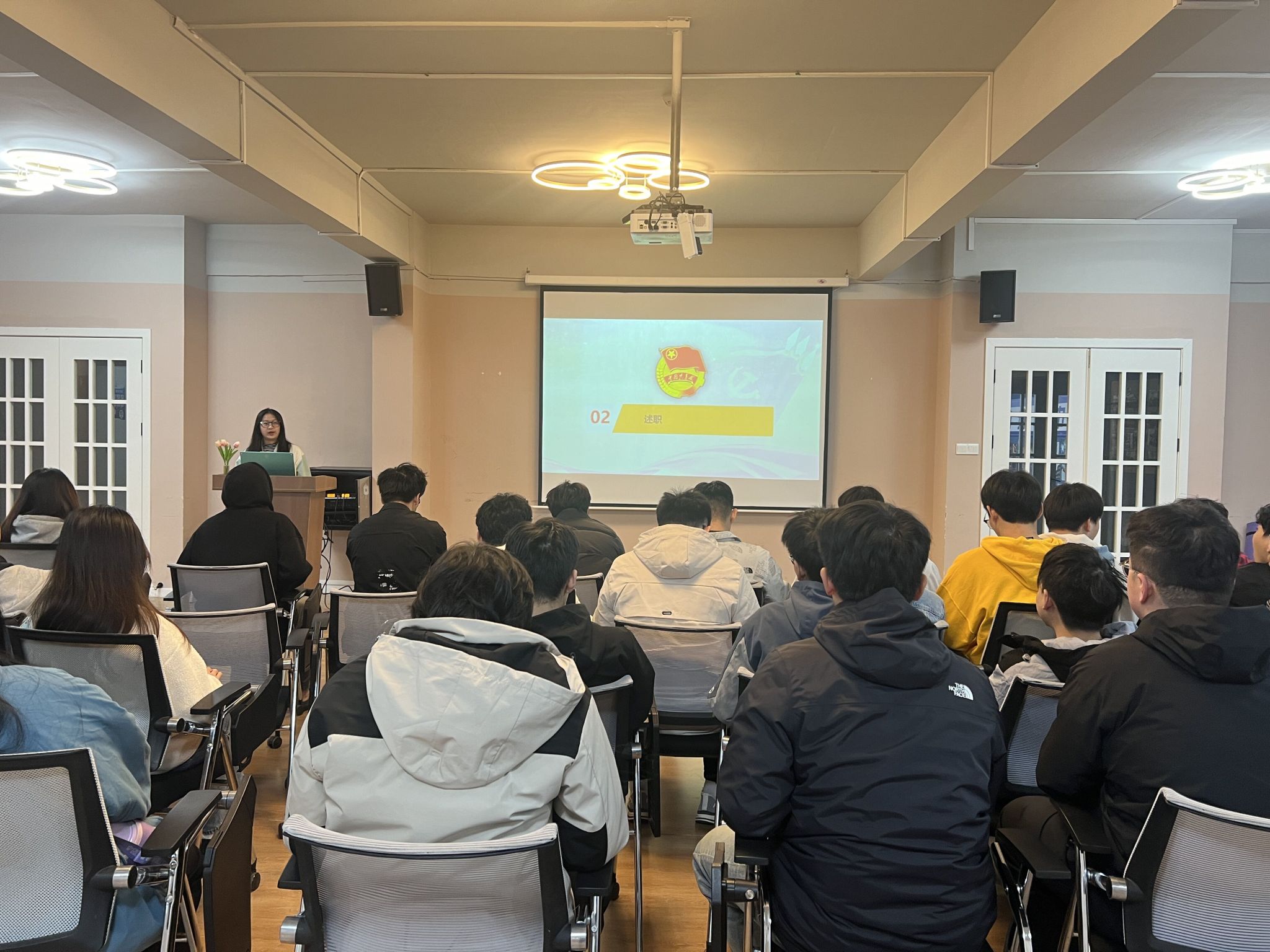 会议伊始,全体成员起立,共同奏唱了充满青春活力的团歌,表达对团组织的忠诚和对青春事业的热爱。随后,团支部书记开场致辞,强调了述职和满意度测评的重要性,同学们积极参与。