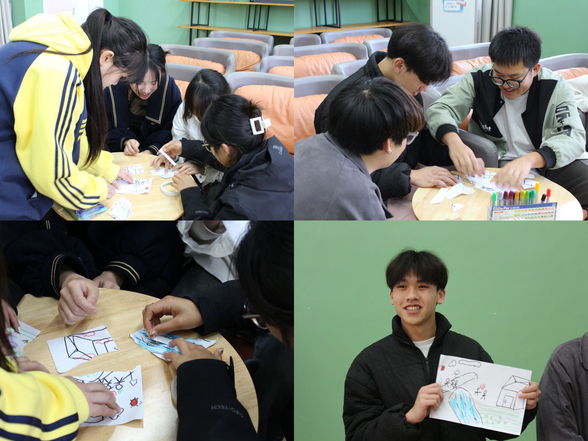 在“你幸福吗”环节中,领导者通过心理咨询中提问这一方式引导大家做一些简单的肢体动作来表达自己的幸福感程度,并让大家分享自己觉得幸福的人和事。在此过程中,领导者循循善诱,耐心引导成员们大胆分享幸福,将“幸福的味道”传播到了功能室的每一个角落。活动过半,领导者通过运用表达性艺术疗法中的绘画心理疗法的方式,让成员自由分组在规定时间内接力画出他们心中的幸福,去挖掘他们潜在的幸福感,同时也能达到放松身心的效果。在这一刻大家的幸福开始具象化,大家开始发现自己的幸福。