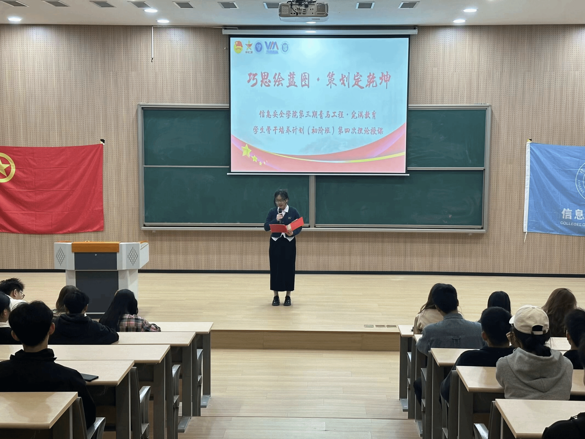 为提升优秀青年骨干的组织能力和决策能力,同时帮助他们更好地处理复杂情况和问题,2024年3月22日,信息安全学院团总支组织部在贤者楼328多功能报告厅开展了“巧思绘蓝图·策划定乾坤”——信息安全学院第三期青马工程·完满教育学生骨干培养计划(初阶班)第四次理论课程。活动邀请到校团委社团发展中心主任杨佳燕老师、信息安全学院团总支书记肖琳老师,此次理论课共计200人参与。
