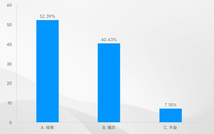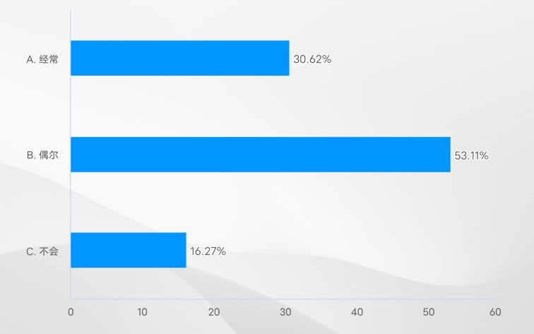 公共场所佩戴口罩:30.62%的同学经常在公共场所佩戴口罩,53.11%的同学偶尔佩戴,有16.27%的同学不在公共场所佩戴口罩。