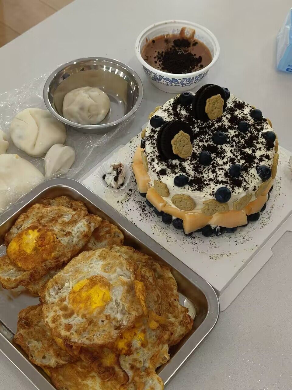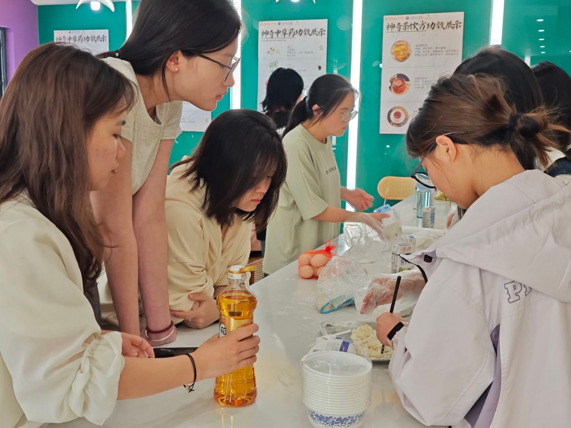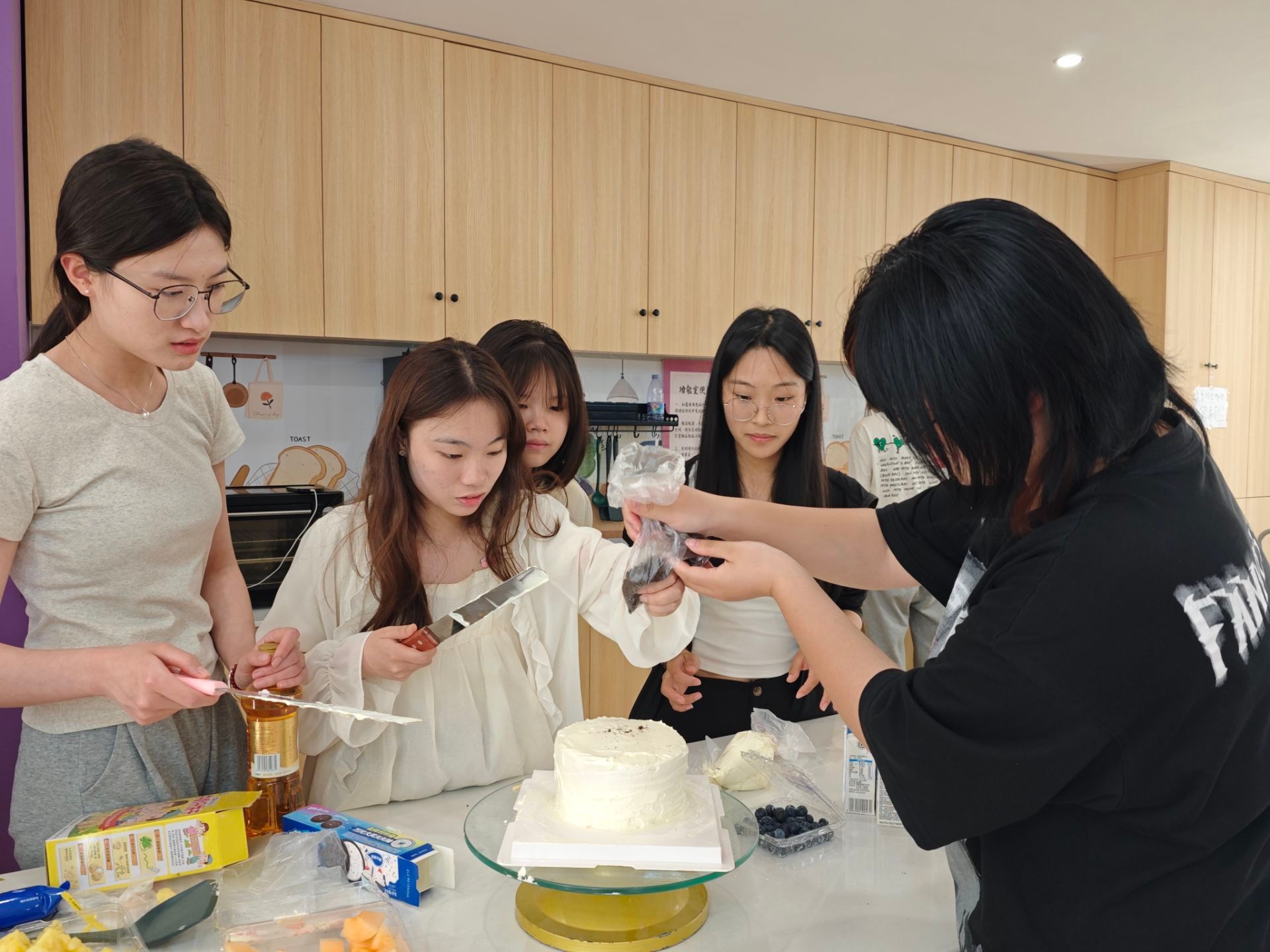 活动当天,小组负责人为同学们采购了必要的物资与糕点原材料,包括面粉、糖、奶油、水果、酸奶等,以及制作糕点所需的模具和工具。制作的过程是考验动手能力与团队协作的时刻,通过共同完成一件事、一项作品让同学们凝结共同的记忆,在互动与交流中加深同学们之间的交流与情谊链接。同学们热情高涨,纷纷围坐在桌前,迫不及待地开始动手制作,一些同学将水果切片摆盘,一些同学和面擀面皮。在小唐老师的指导下,同学们认真地学习着糕点制作的基本技巧和方法。他们用手中的奶油,绘画出各种形状,再用水果进行点缀与创作。在烘烤的过程中,共享厨房弥漫着诱人的香气,让人垂涎欲滴。