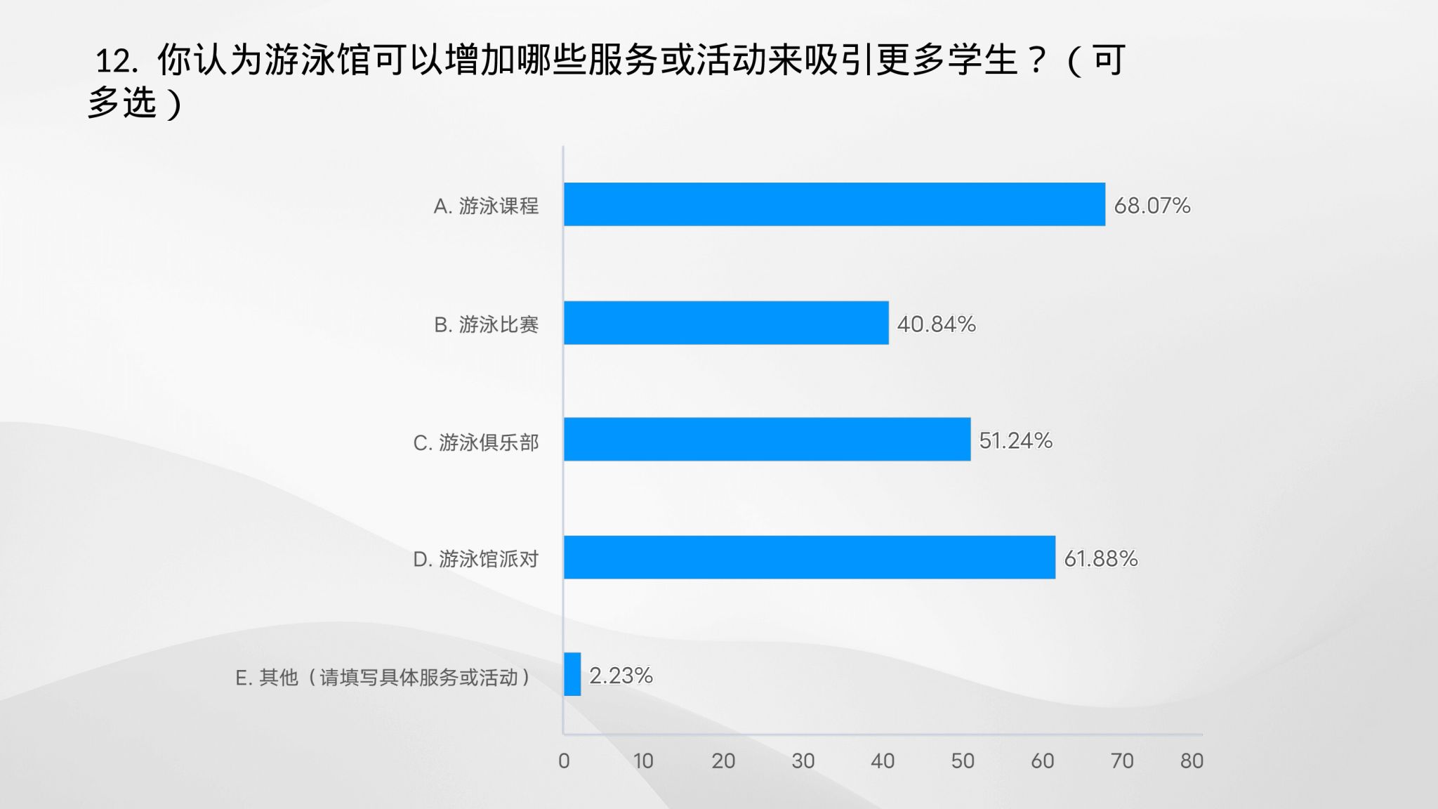 (三) 希望大学能够提供更多的游泳课程以及相关活动,丰富大学生的健身选择。