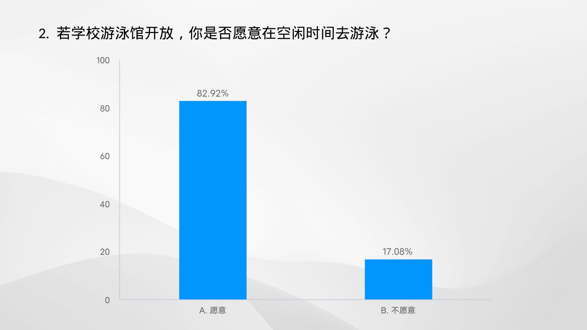 当代大学生在全面身心发展的教育理念下,体育技能的培养越来越受到重视。为响应“体育承载着国家强盛、民族振兴的梦想”的指导思想,重庆移通学院綦江校区开设了游泳课,并组建了游泳馆、游泳池等配套设施。2024年3月27日-3月30日,信息安全学院团总支调研部进行了一项关于开放游泳馆的学生态度情况调查问卷。