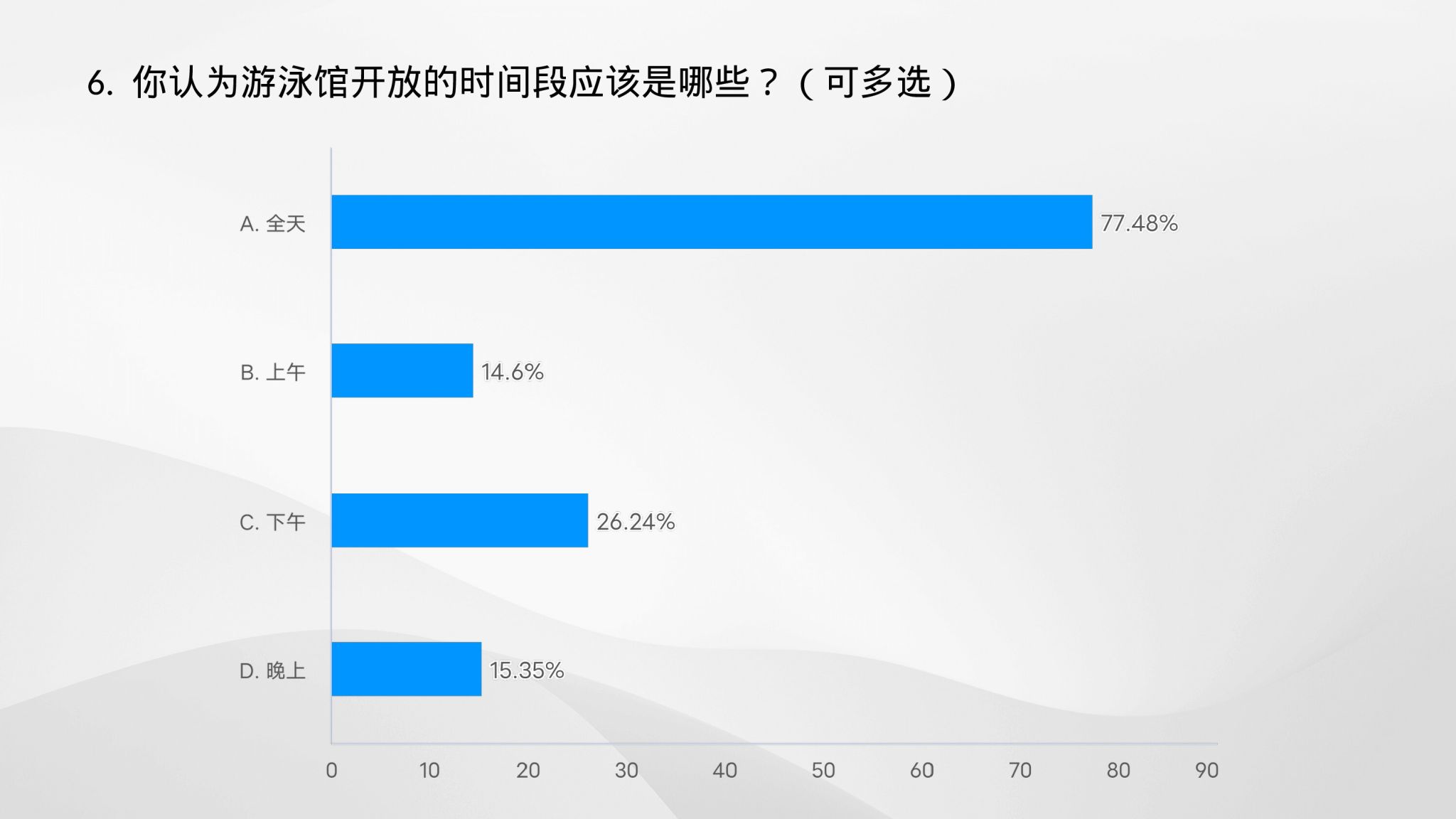 (一) 大多数大学生对大学游泳馆的开放持积极态度,认为游泳馆应该对所有学生开放,并希望开放时间能够延长。