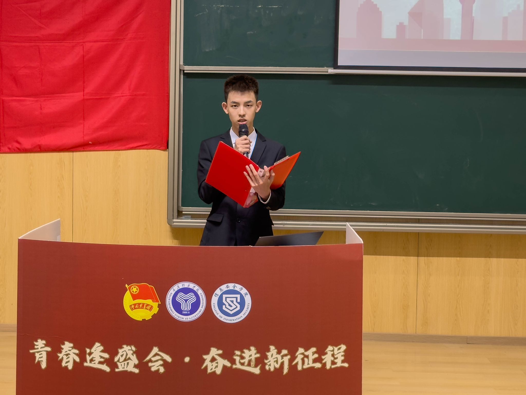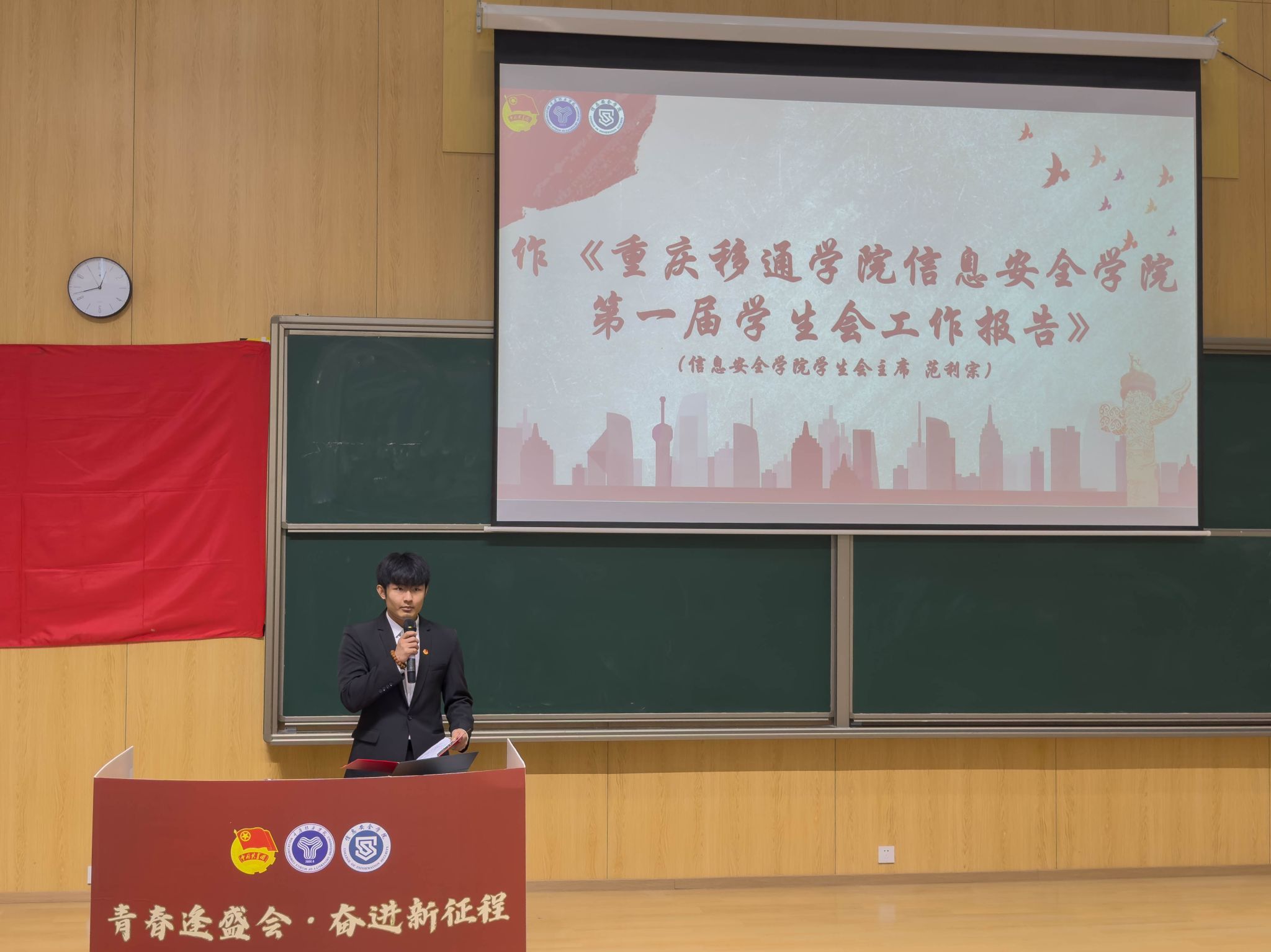 信息安全学院第一届学生会主席范利宗作主题为《青春恰似火,扬帆正当时,把我们的青春嵌入信安的相框》的学生会工作报告,报告总结了第一届学生会的工作成果和经验,并提出了对未来的规划与期待,这将对新一届学生会的工作产生积极的影响。
