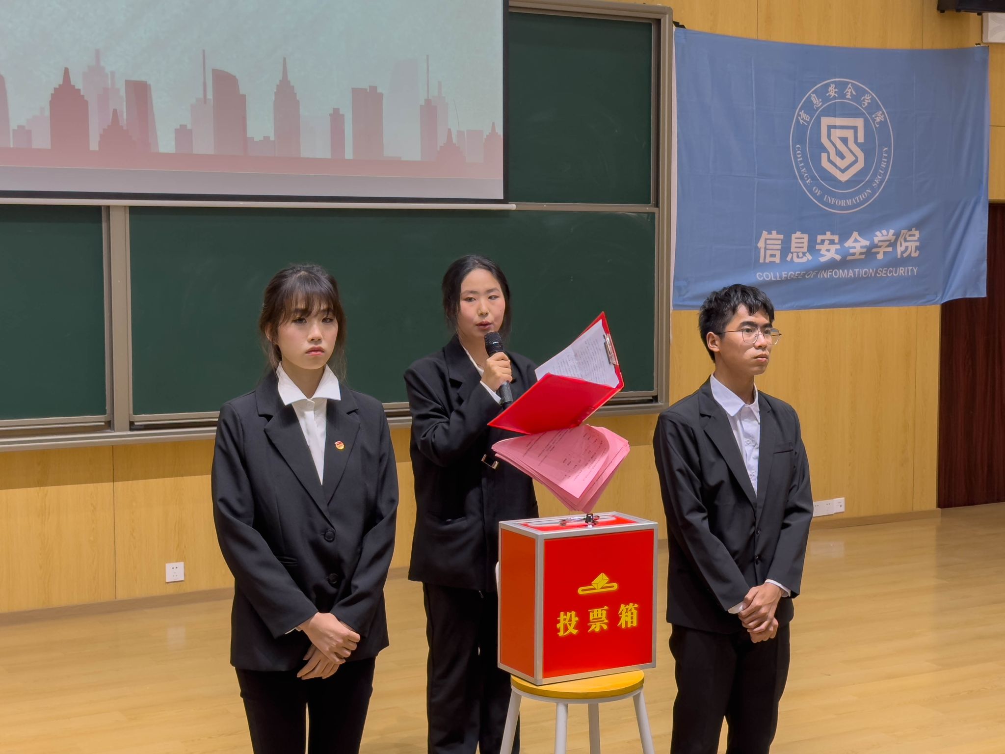 本次大会秉承公平公正公开的原则,以无记名纸质投票的方式选举产生3名重庆移通学院信息安全学院第二届学生会主席团成员。