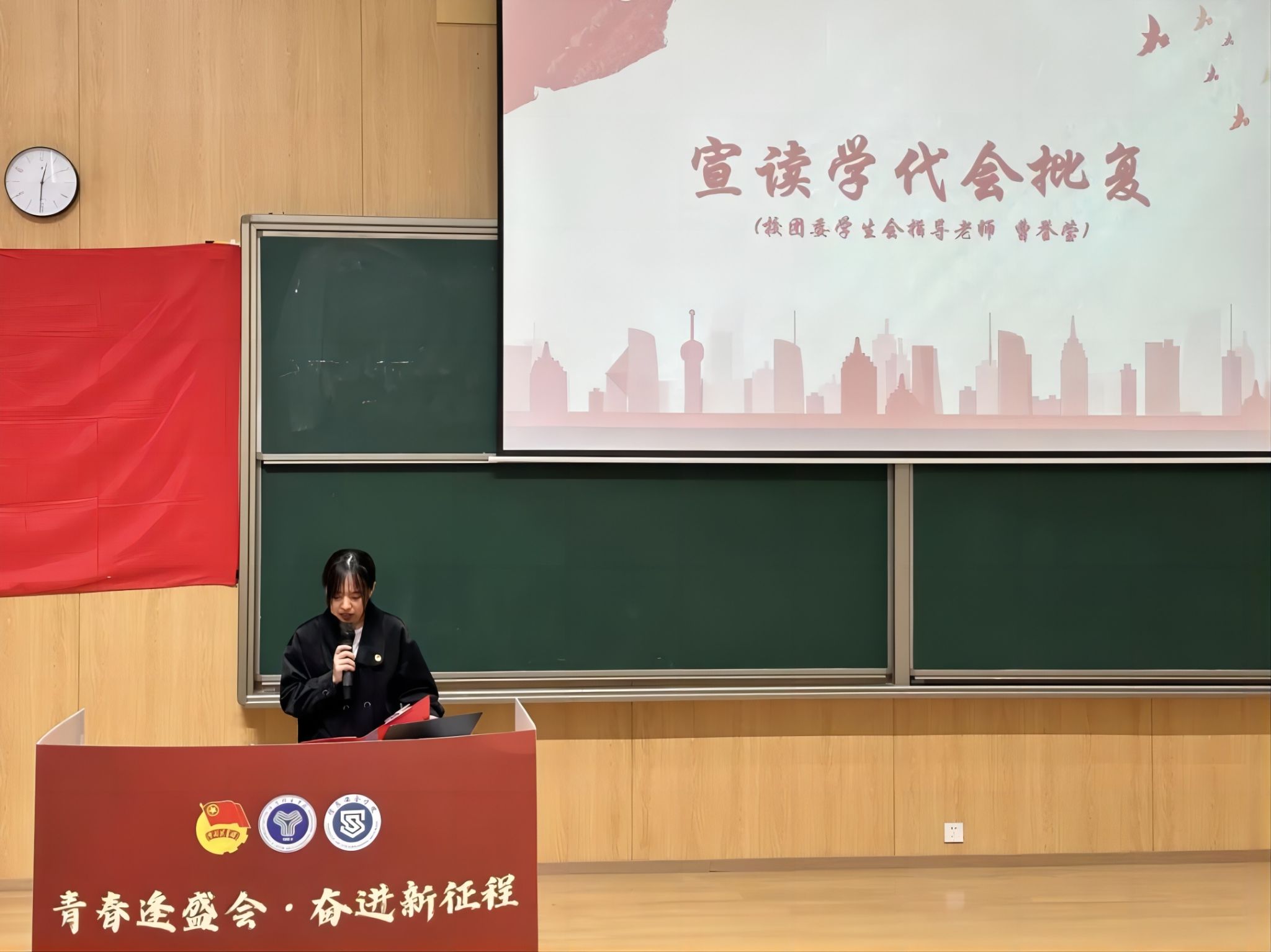 校团委学生会指导老师曹誉莹宣读《关于同意召开重庆移通学院信息安全学院第二次学生代表大会的批复》