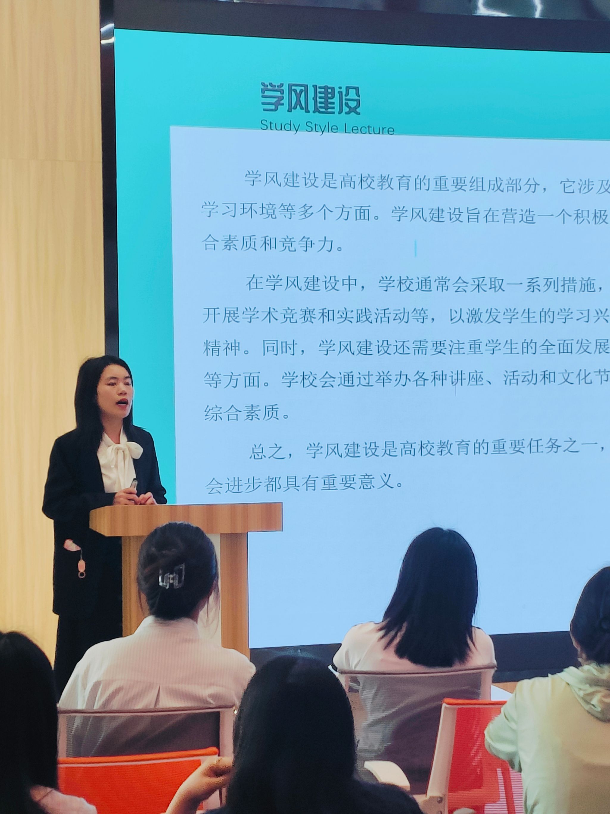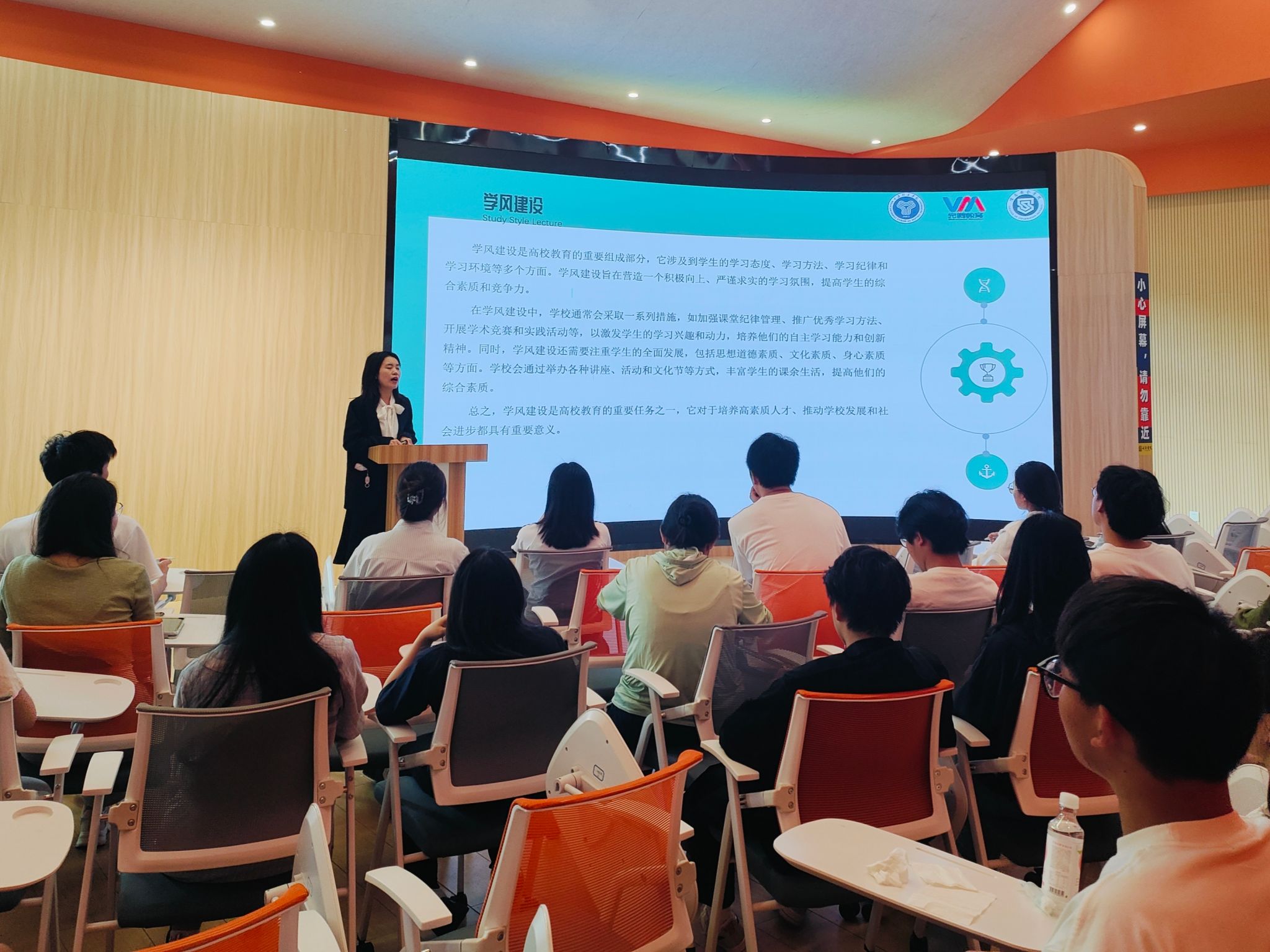 在分析现状时,她指出了当前学风建设中存在的主要问题:学生对学风建设相关活动的参与度不高。她通过具体数据和实例,展示了这一问题对学风建设的影响,并呼吁同学们要重视并改变这一现状。