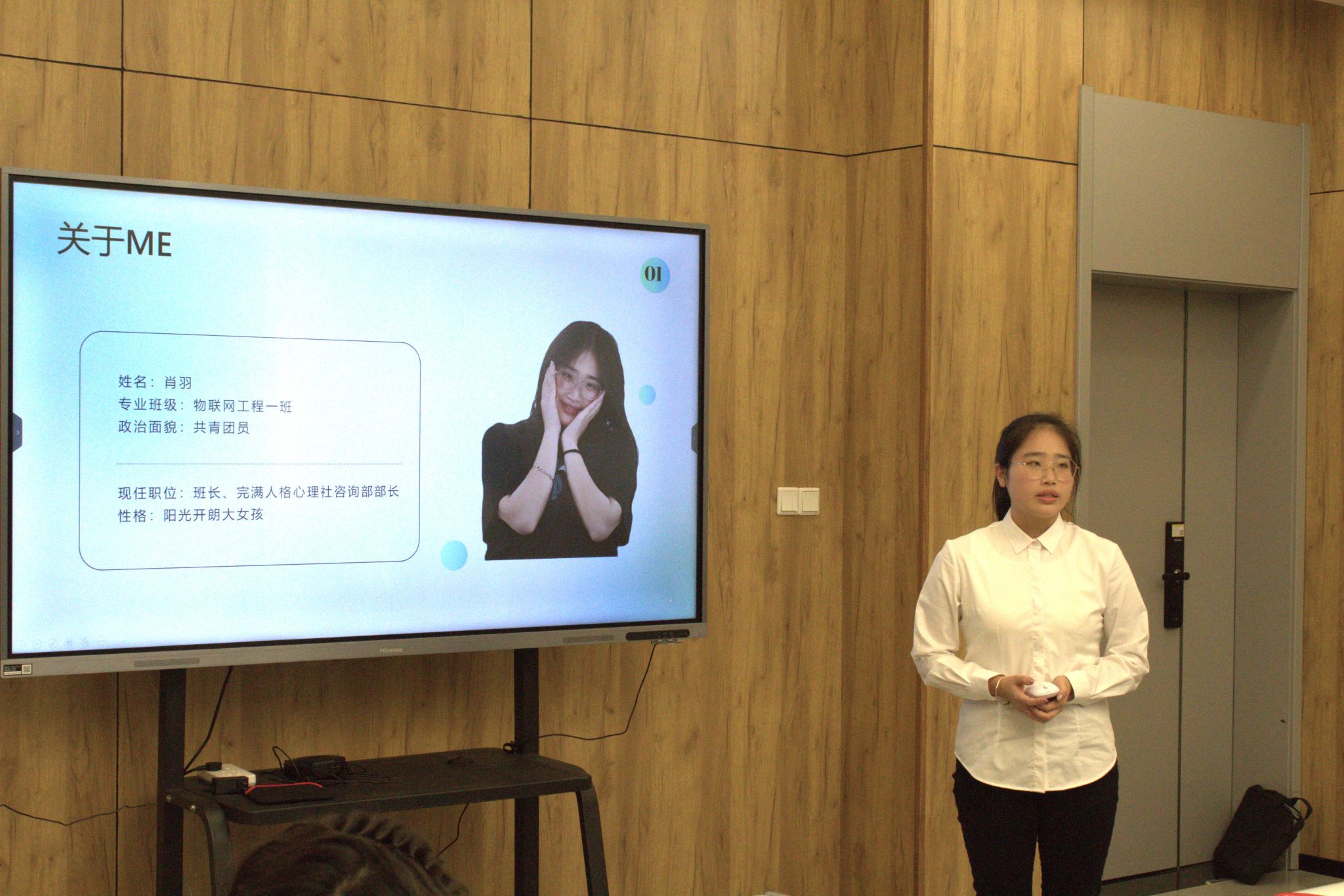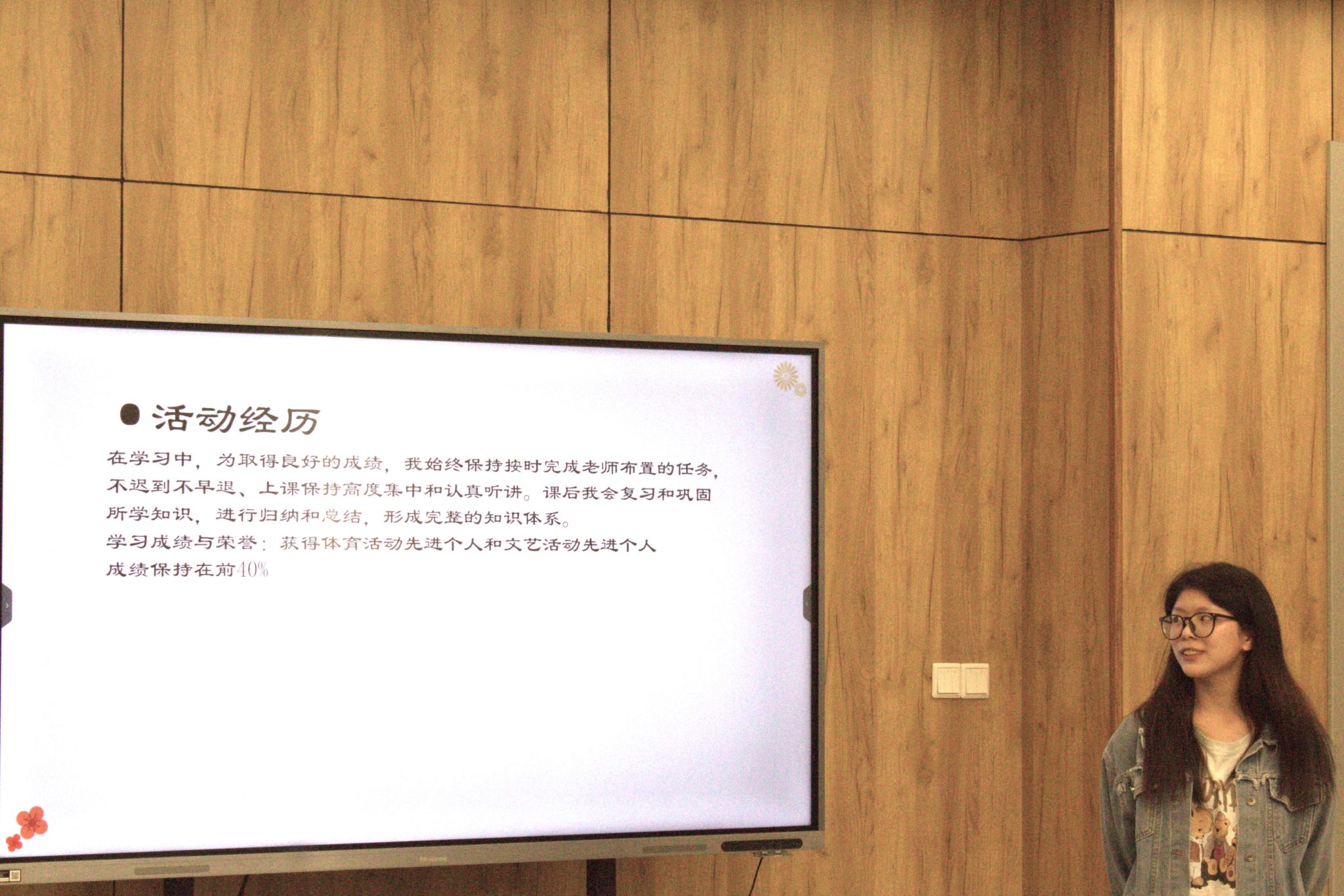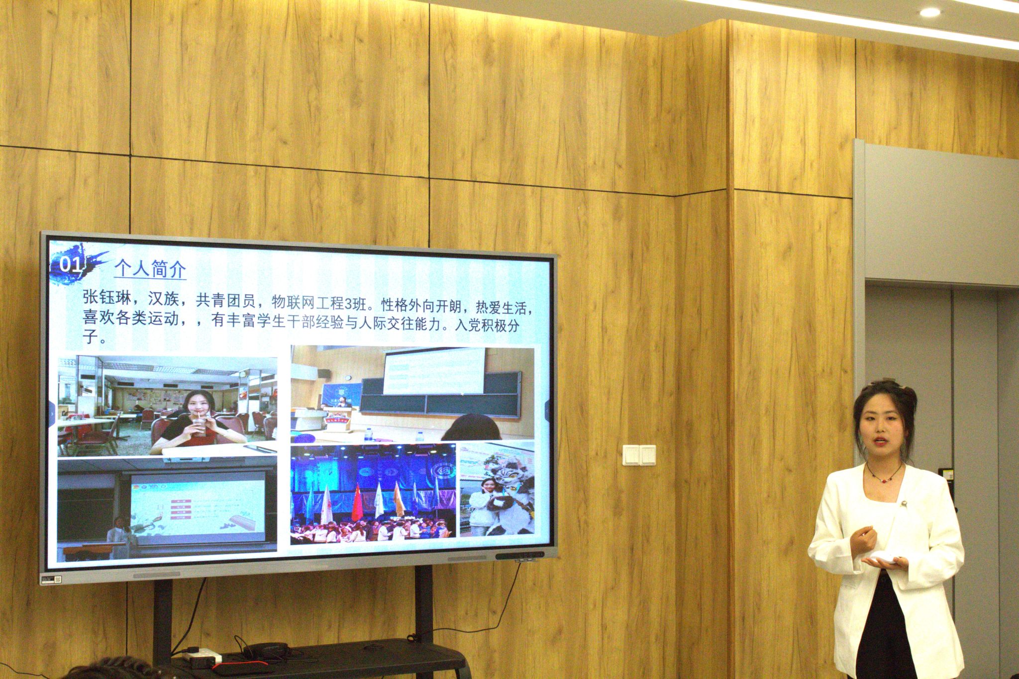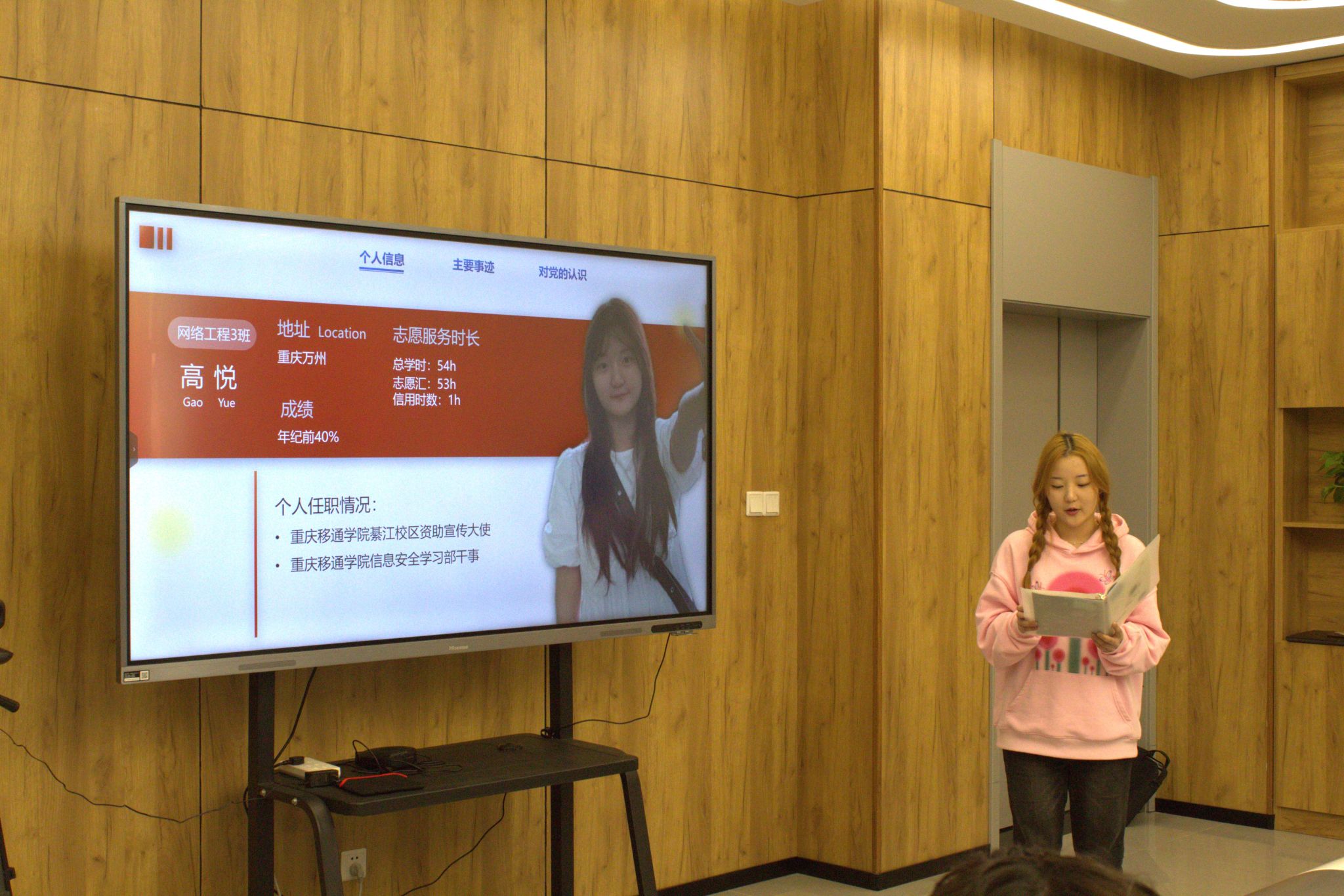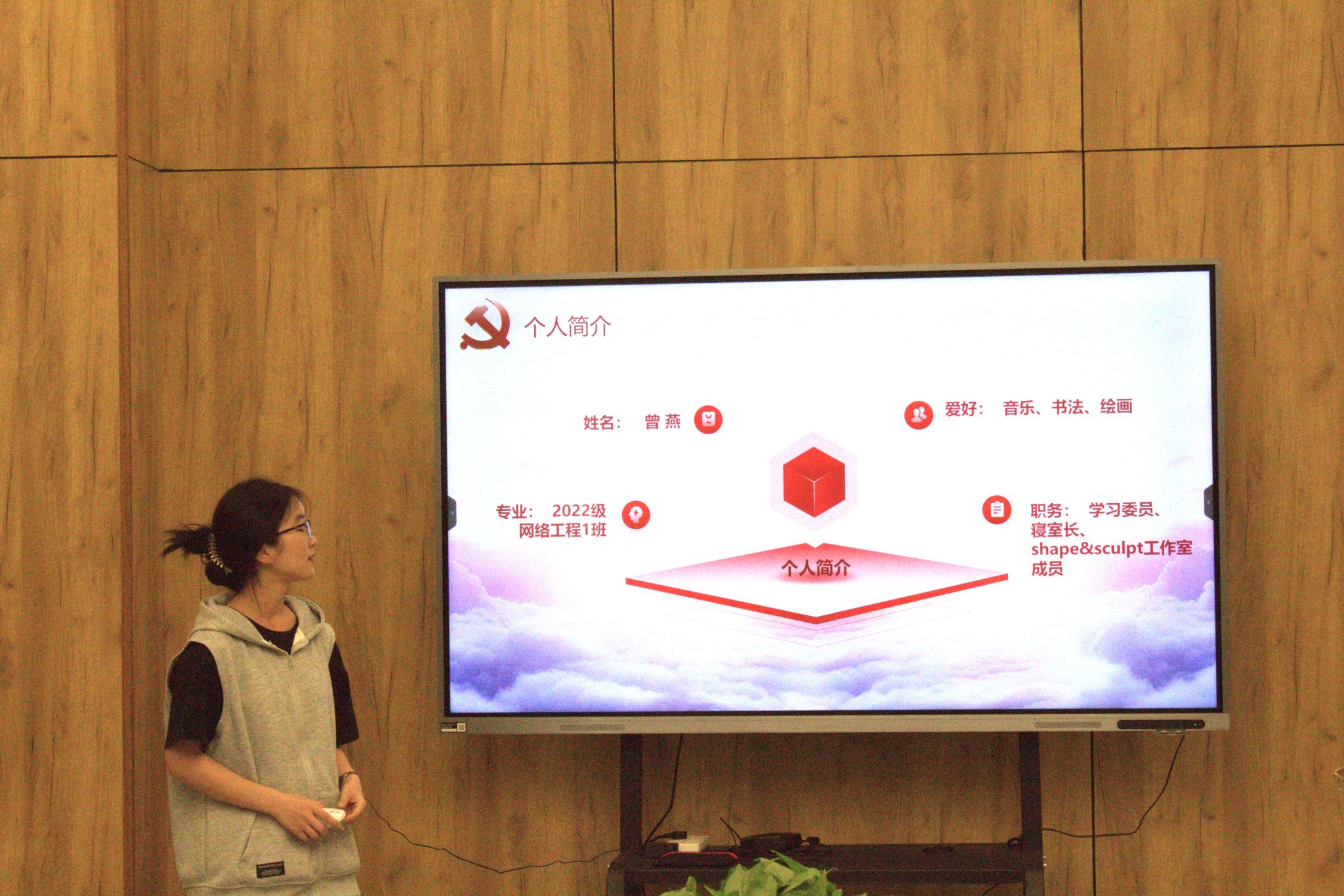 首先进行答辩的是曾燕同学。她分别从个人、学习、工作以及思想四个方面开展此次答辩。在她的答辩中,我们能清楚感受到她作为一名班委,尽职尽责地诶老师同学服务;作为一名学生,她全面发展自己;作为一名共青团员,她不断汲取新思想,做新青年。