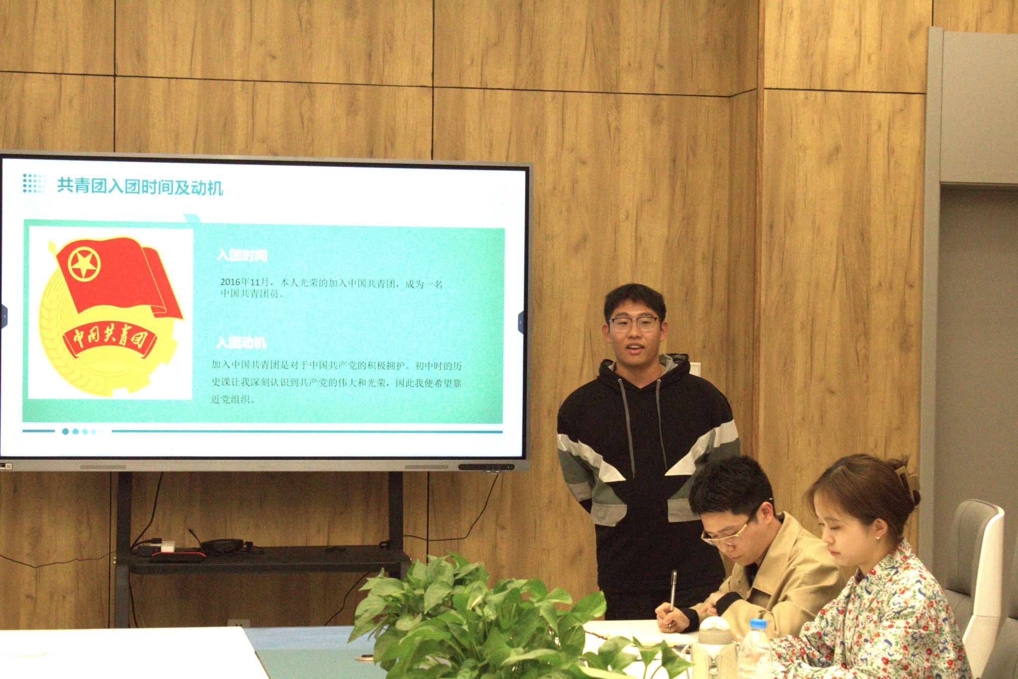 王吉青同学对自己从群众到共青团员再到入党积极分子的历程进行详细的阐述。她说“我追寻的光,是五角星的光”。在答辩中她主要对自己如何成长进行陈述。追逐光:她一直在追寻各种优秀者的脚步;她成为光:她不断学习成长,担任部长,组织活动,努力做一名优秀的共青团员;她发散光:她将自己的光照到每一个角落。