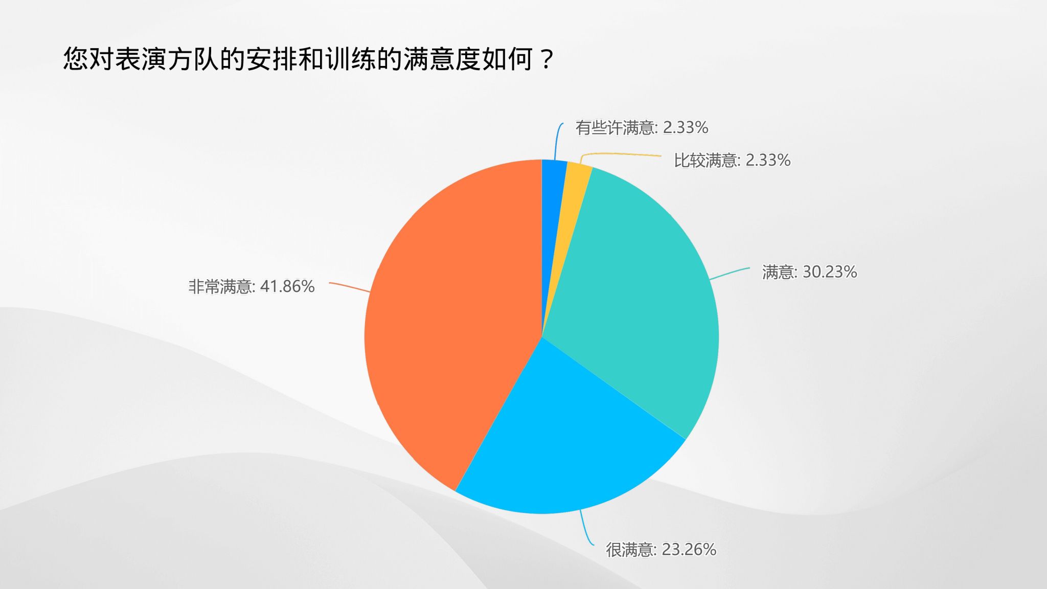 调研数据显示,全体表演方队人员对学院表演方队的训练安排和训练强度表示满意,95.35%的同学认为自身的准备情况较为充分,对表演节目有较大信心。