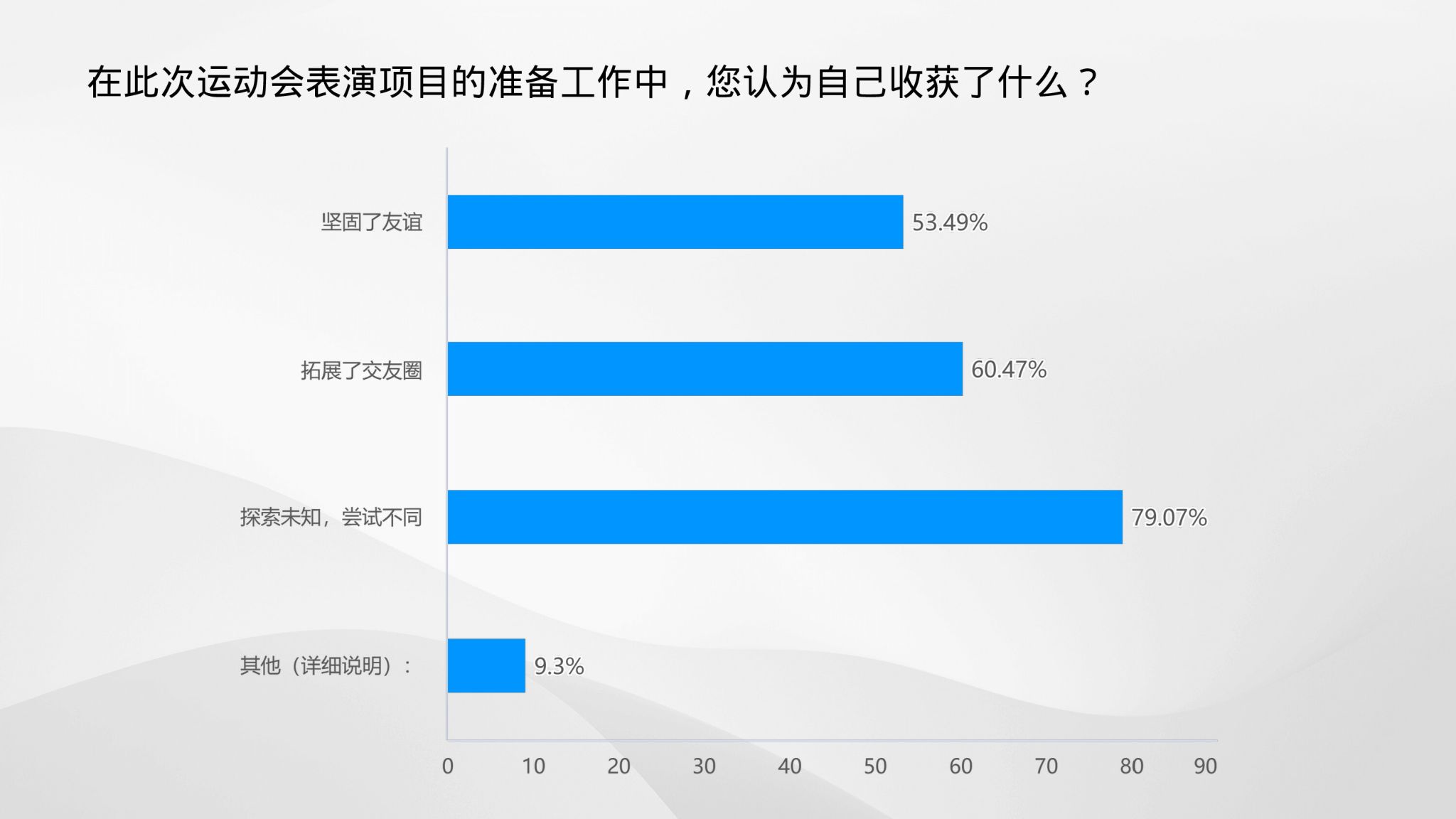 提及参与者的情绪、心理状态,表演方队成员表示兴奋、快乐与紧张、疲惫并存。同时,53.49%的受访者表示坚固了友谊,79.07%的受访者表示通过此次训练探索了未知,尝试了不同,增添了大学生活体验。