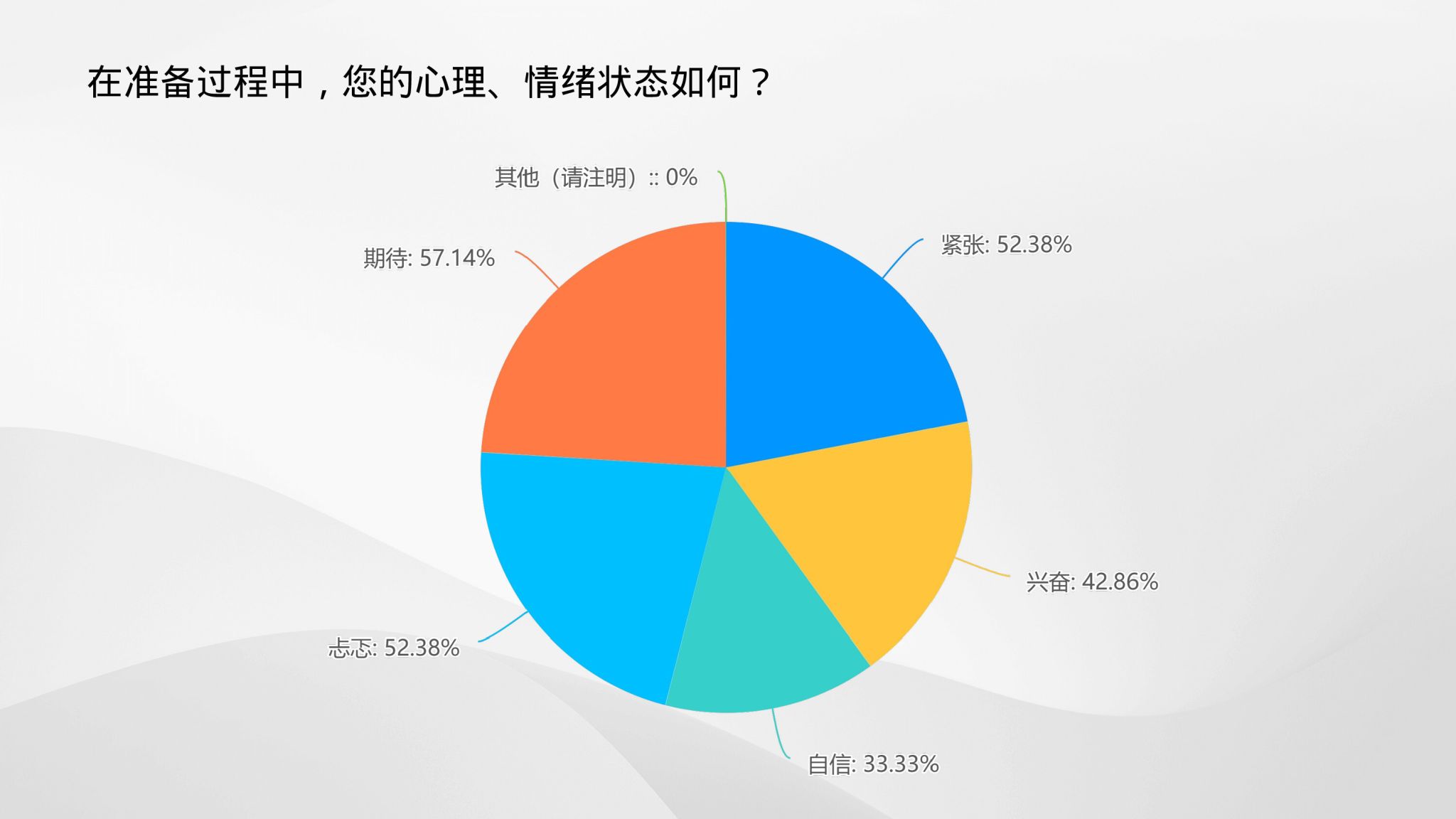 在准备过程中,运动员们的情绪各异,52.38%的人表示紧张42.86%的人表示兴奋,33.33%的人表示自信,57.14%的人表示期待,同学也有52.38%的人表示心有忐忑,整体上对于获奖有较大信心。