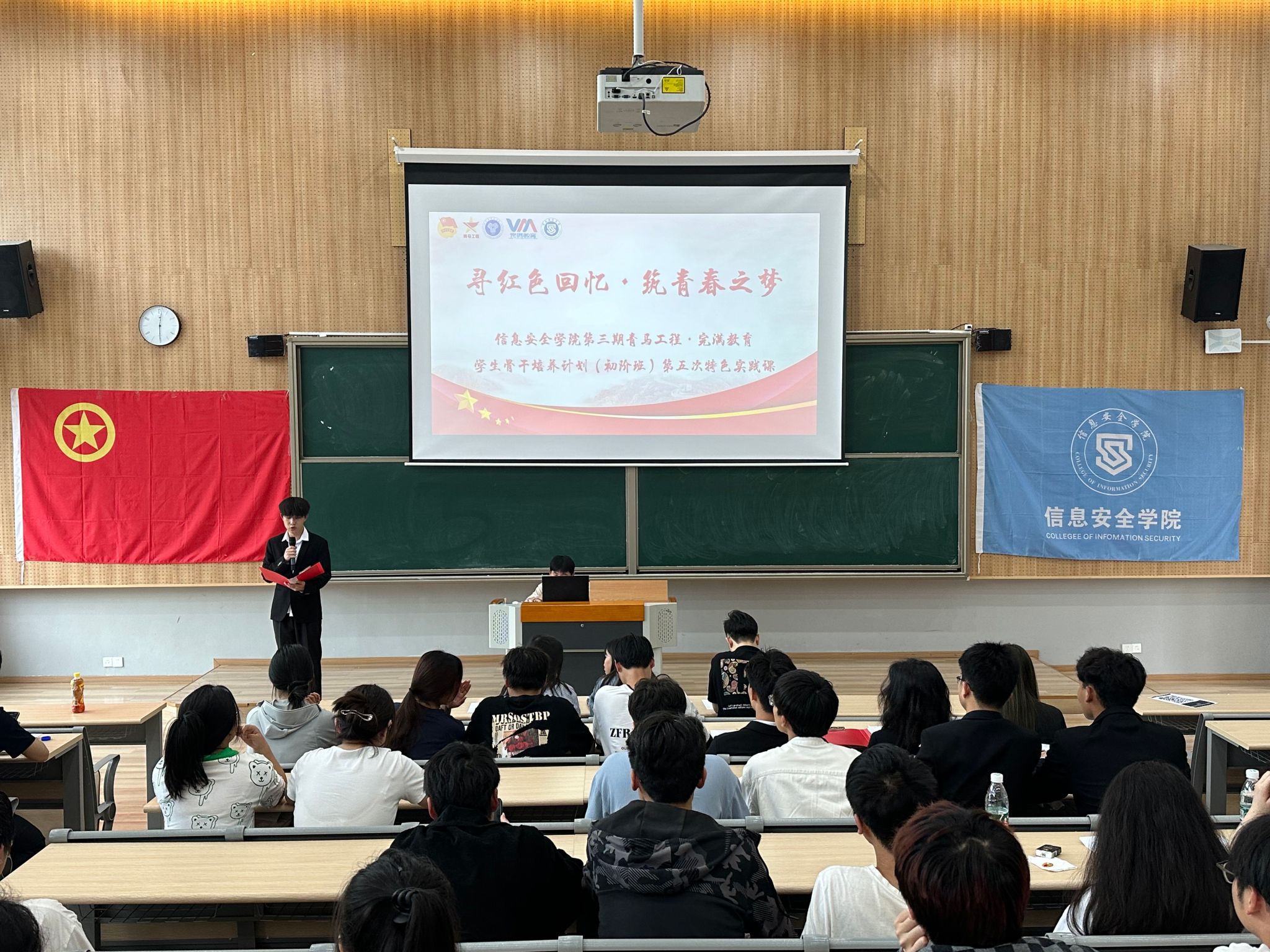 在春风拂面、万物复苏的美好时节,信息安全学院团总支组织部于2024年4月17日在横山书院阶梯教室开展了“寻红色记忆·筑青春之梦”——信息安全学院第三期青马工程·完满教育学生骨干培养计划(初阶班)第五次实践课程。此次活动旨在提供一个平台,锻炼青马学员的演讲能力,增强青年的使命感,责任感和荣誉感。活动邀请到信息安全学院学工副院长尹金维老师、部门指导老师谭倩老师、王辅崇老师。