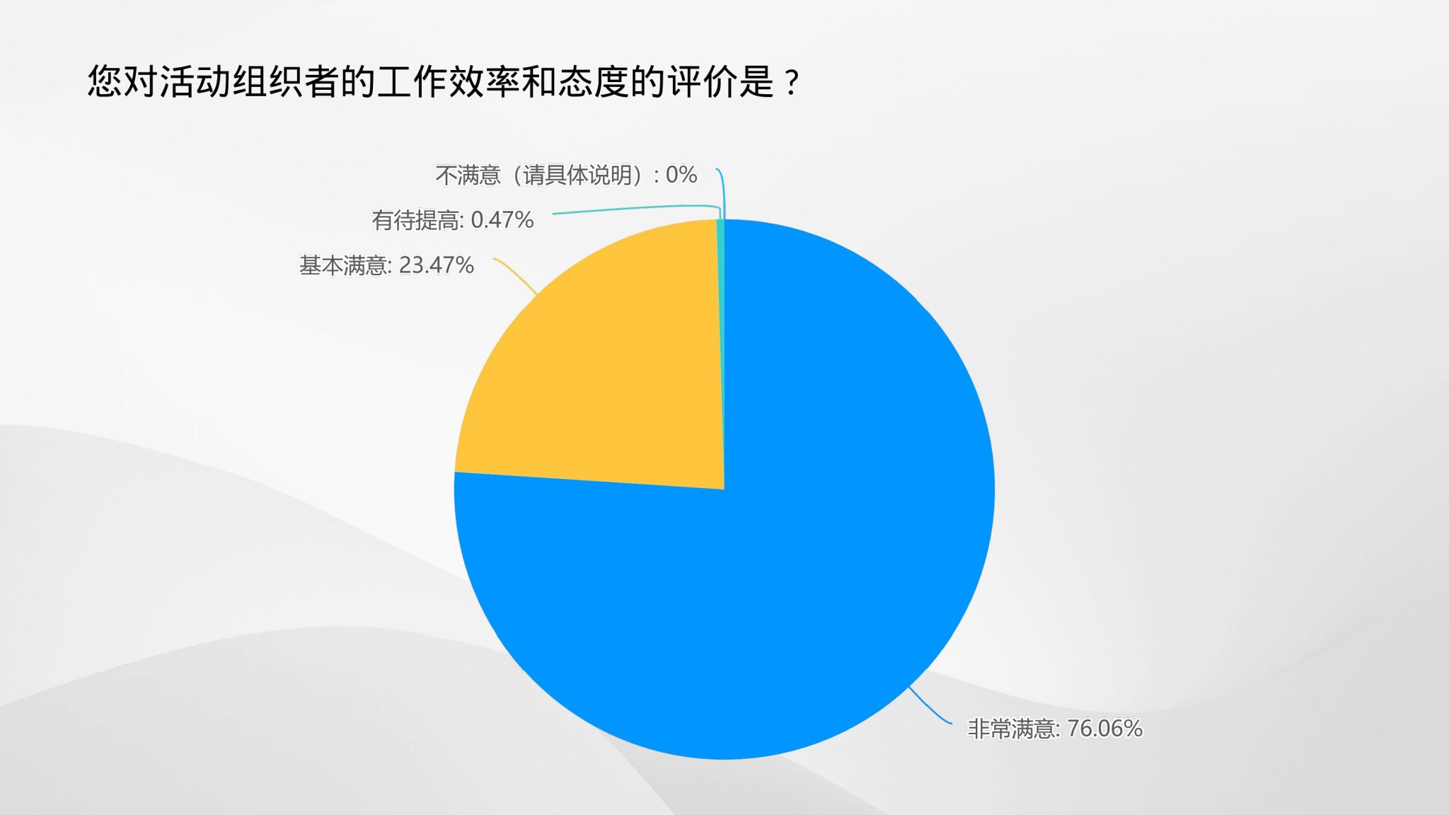 在活动组织方面,对于组织者的工作效率和态度感到非常满意的人数占到总人数的76.06%,这一数据能够从侧面反映出,活动的准备工作比较完善,参与者体验感良好。