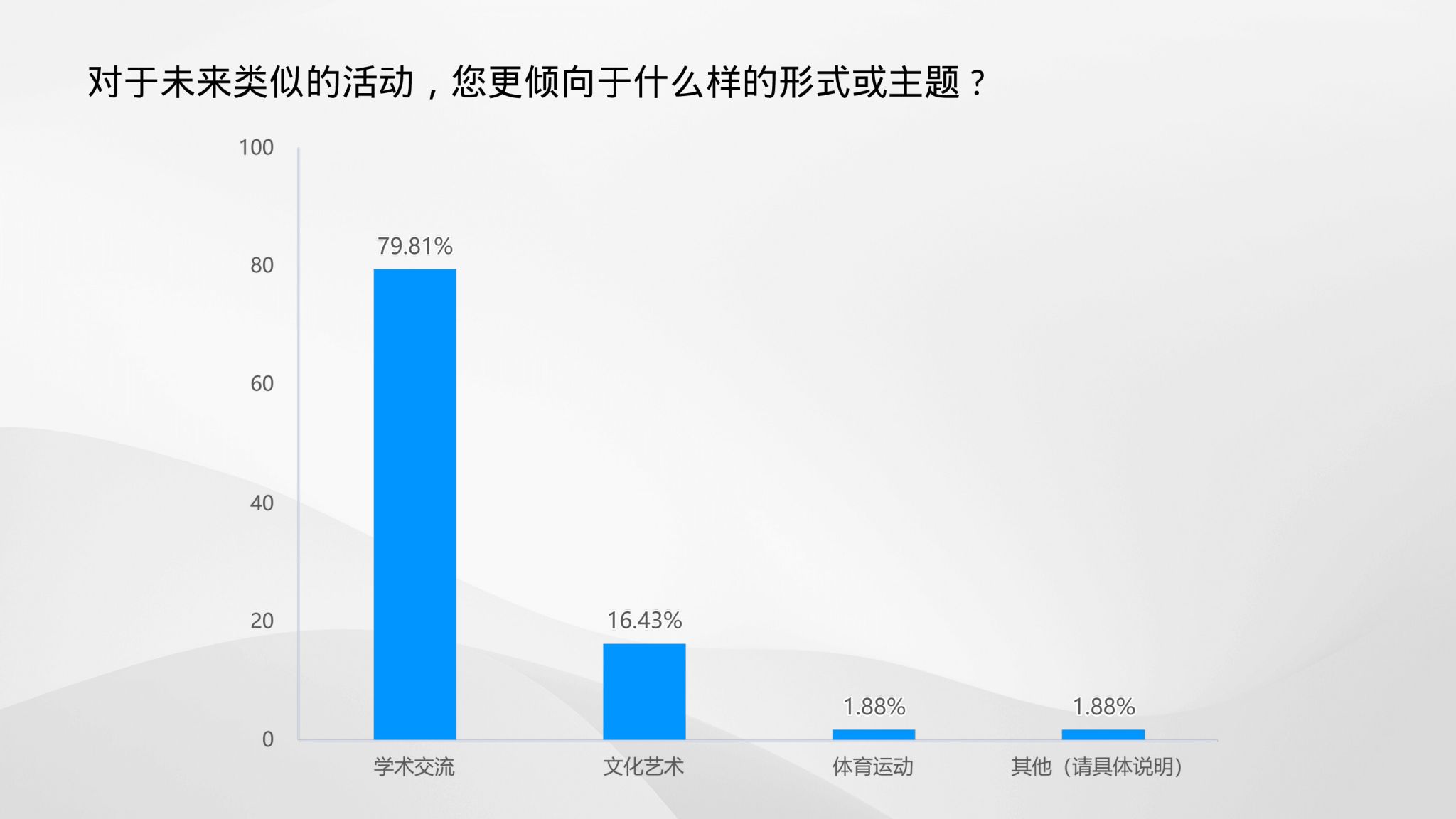 在关于活动意向的调查中了解到,79.81%的受访者表示自己倾向学术交流,足以看出同学们普遍希望拓展就业技能与知识,提升自我在职场中的竞争力。在活动期望匹配值的调研中,全体受访者表示活动开展完全符合期望,由此看出本次活动对学生们在职业规划及求职需求方面给予极大的帮助。