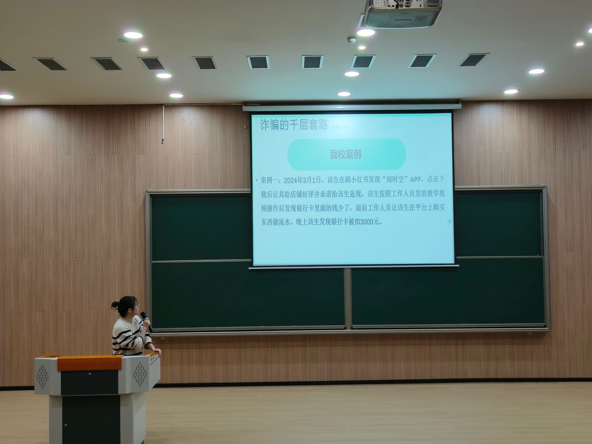 为了加强学生的安全意识和防诈骗能力,同时提醒学生在五一节期间注意安全,2024年4月24日19:10,2023级软件工程专升本1-6班在贤者楼328阶梯教室开展了以“巩固安全·预防诈骗”为主题的安全教育暨反诈宣传大会。