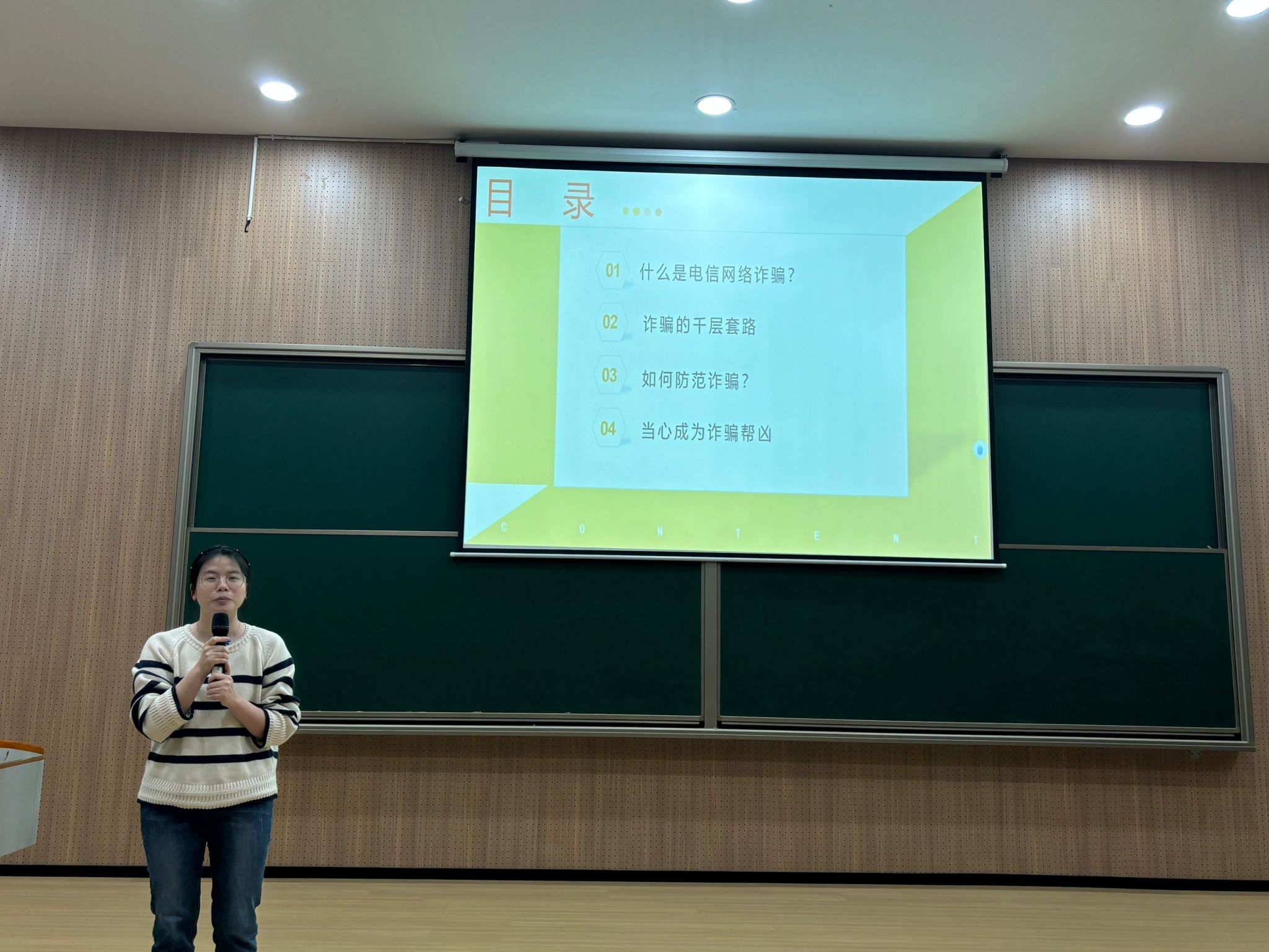 近期被诈骗的频率较高,为了提高同学们的甄别能力和应对能力,肖琳老师以身边真实案例对同学们进行教育,以有效遏制电信诈骗高发事态,切实保障学生的财产安全,并创建平安和谐的校园环境。同时,她详细介绍了当前电信诈骗犯罪的严峻形势、最新特点以及常见类型,重点讲解与学生相关的电信网络诈骗套路和防范措施,提高同学们的警惕心。