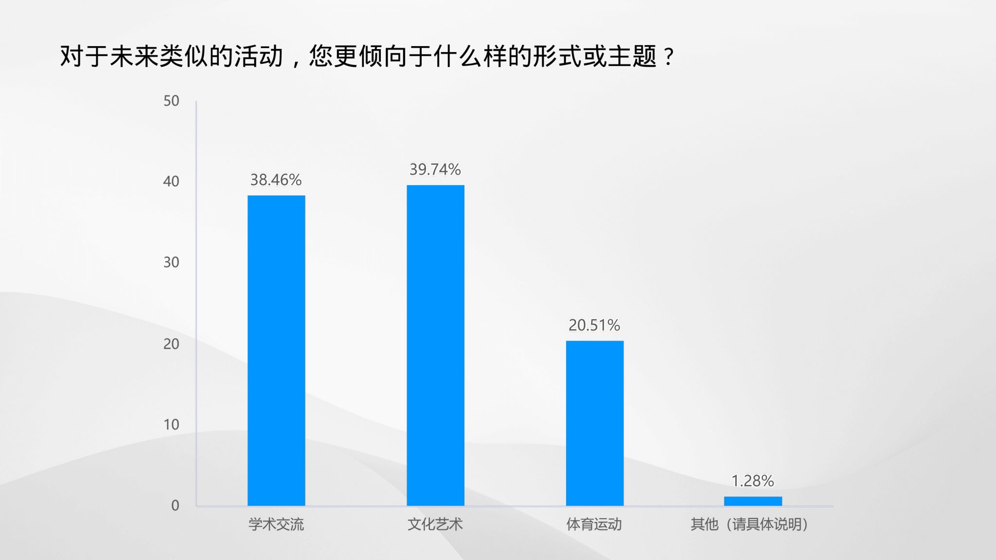最后,受访者对信息安全学院院长交流会的活动意向呈现多元化特点。学术交流因专业性和深度备受青睐,占比达38.46%。同时,文化艺术和体育活动也以其独特魅力吸引了不少学生,分别占比38.74%和20.51%。这一数据反映出在策划未来活动时,应综合考虑学生的多元化需求,设计更具吸引力的活动形式,以促进学生全面发展。