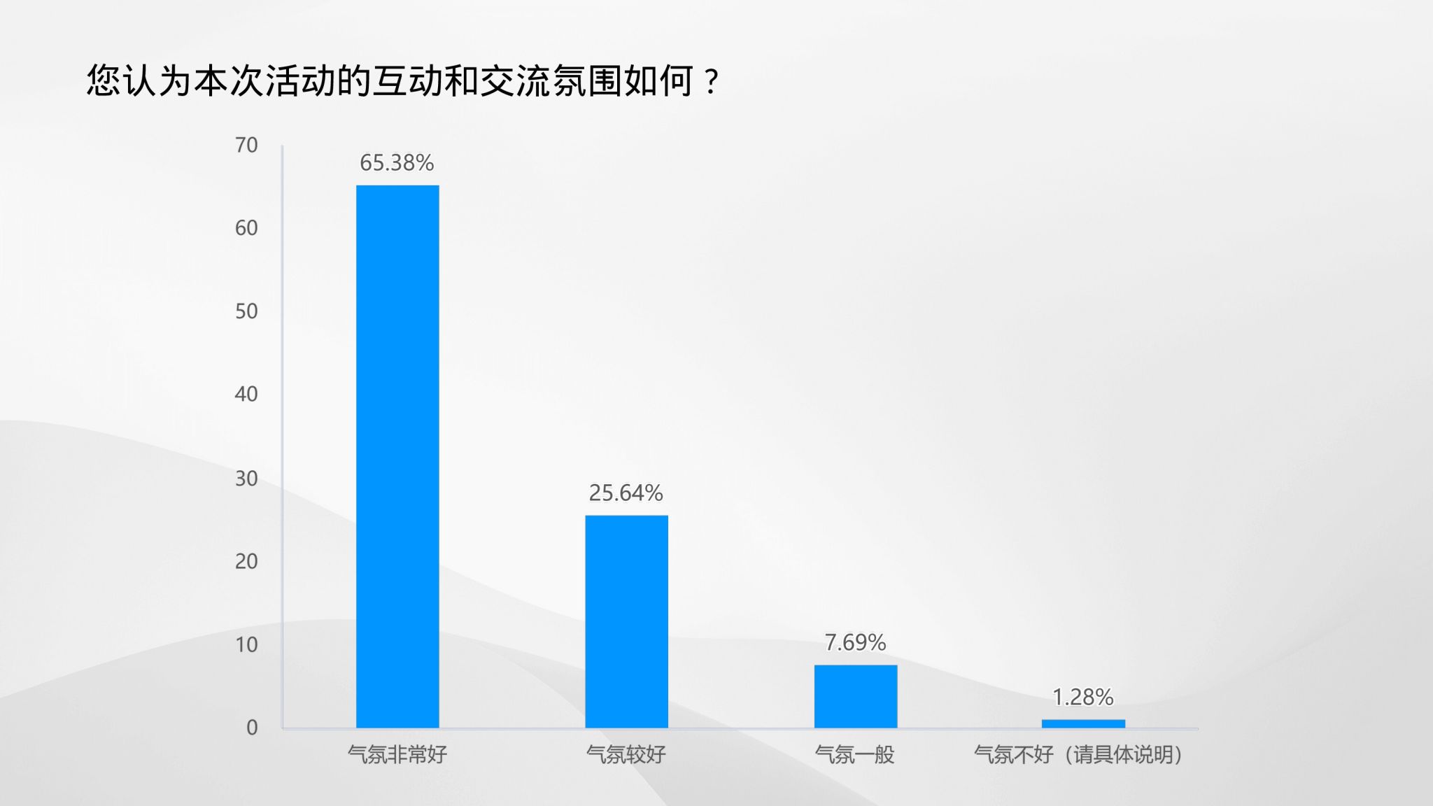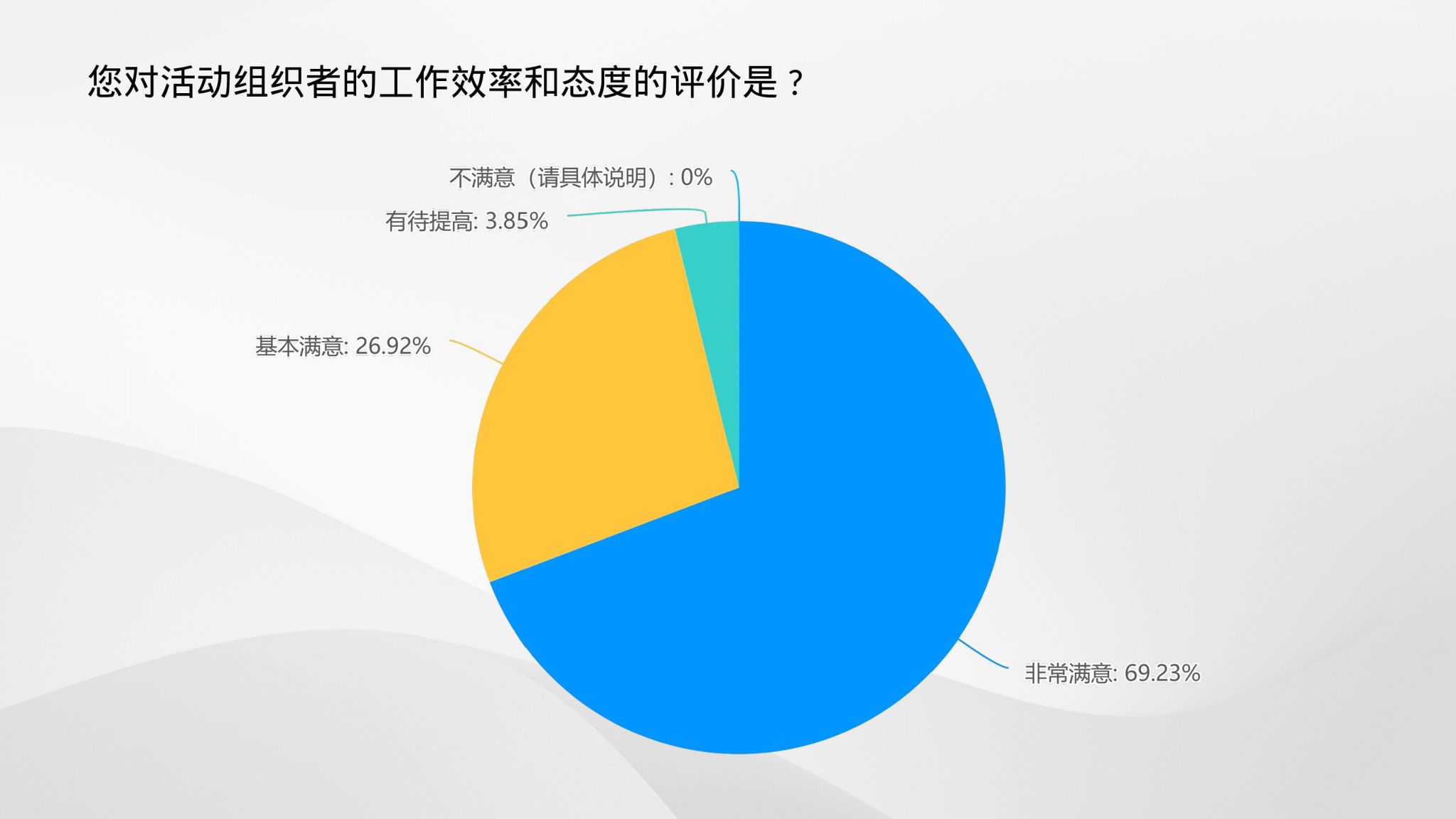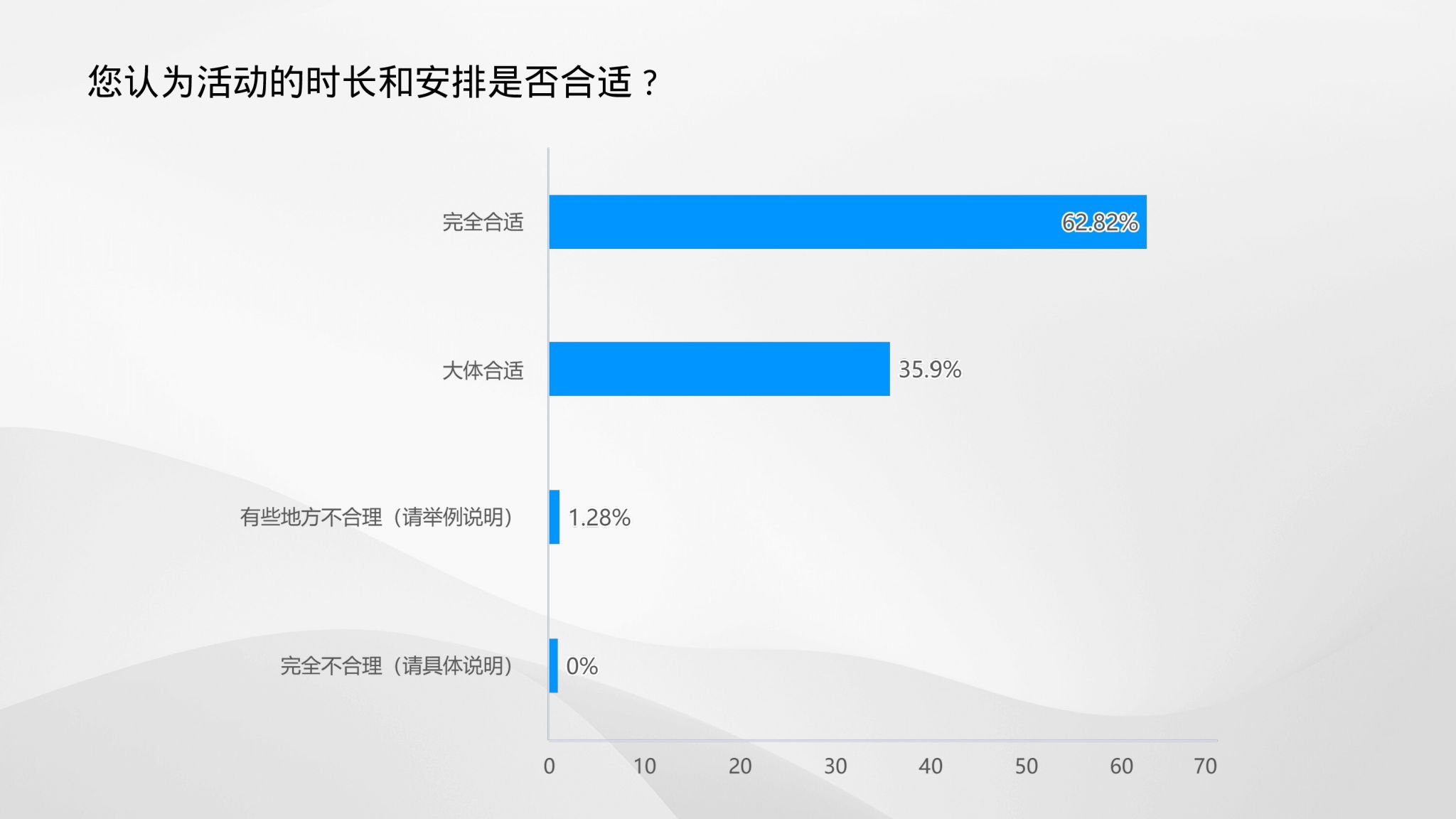同时,活动组织方面的调查数据显示,对于组织者的工作效率和态度感到非常满意的人数占到总人数的69.23%,认为这次活动的时长与安排合适的占比达到了总人数的62.82%。