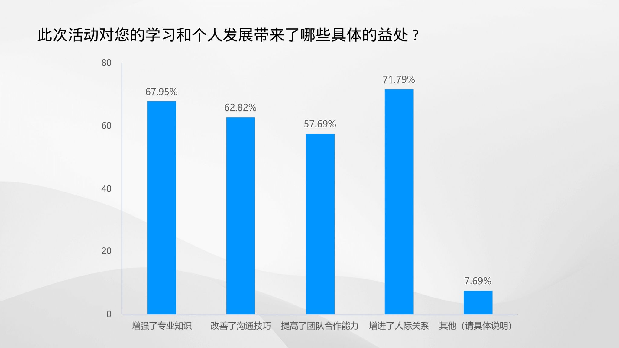 本次调研在提及活动参与感受与收获中,过半数为受访者的受访者表示自己从活动中增强了专业知识、提高沟通技巧、提高了合作能力、增进了人际关系。65.38%的受访者认为本次活动的互动和交流氛围非常好,老师们也对活动开展感到非常满意。
